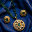 An exquisite round pendant set featuring a rich emerald-toned centerpiece, encircled by delicate pearl accents and sparkling kundan-style stones. Paired with a multi-layered green bead chain and matching stud earrings, this royal-inspired design radiates timeless elegance—perfect for weddings, festive celebrations, and traditional occasions.
