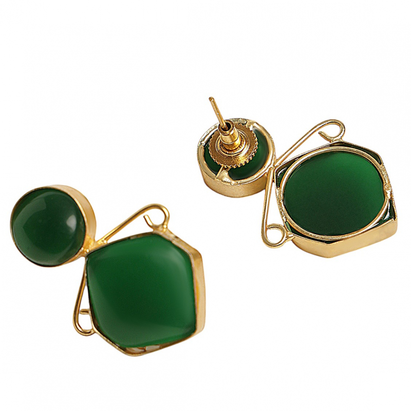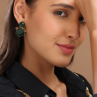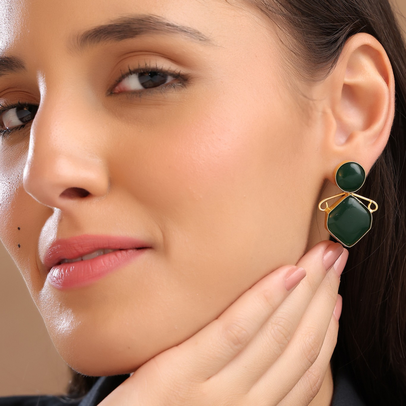 Make a bold yet refined statement with these emerald muse earrings, designed with rich green stones in a modern geometric silhouette. The combination of a round stud top and a uniquely shaped drop creates a contemporary yet elegant look. Set in a polished gold-tone frame, these earrings bring out a luxurious charm, perfect for elevating both ethnic and western outfits. Lightweight and stylish, they are ideal for day-to-evening wear.