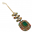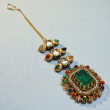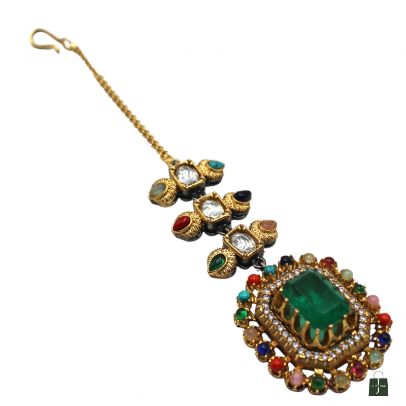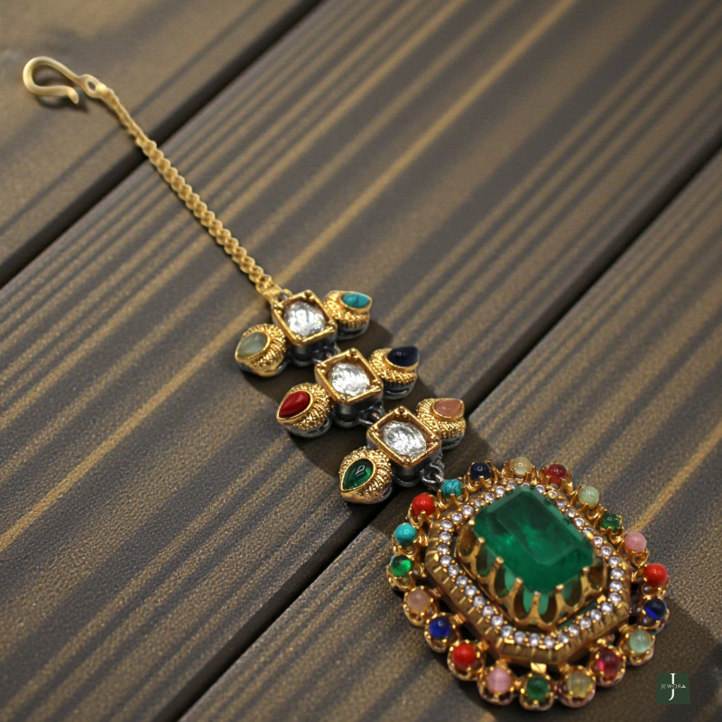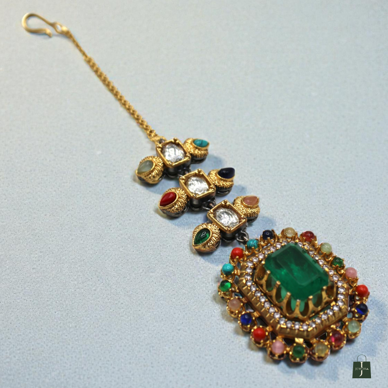 Enhance your ethnic elegance with this stunning Emerald Navratna Maang Tikka, designed to bring royal charm to your festive and bridal look. The centerpiece features a bold rectangular emerald-green stone, beautifully elevated with golden prong detailing and surrounded by sparkling micro stones.