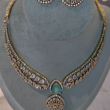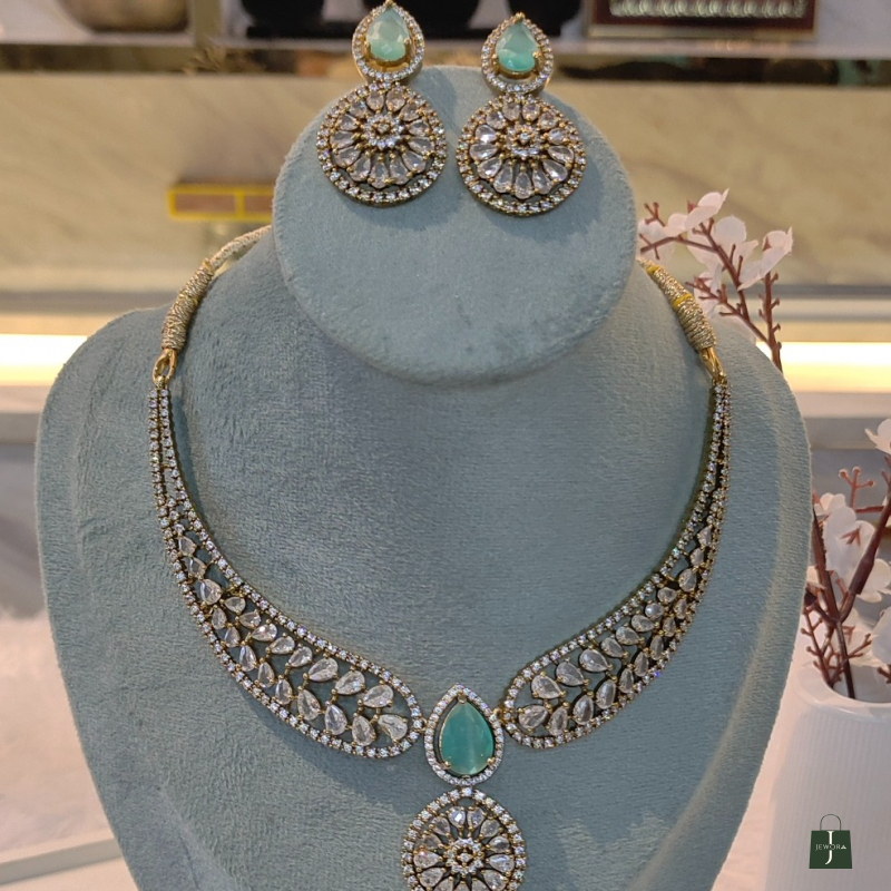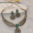 The Emerald Noor Kundan Necklace Set is a luxurious traditional jewellery set inspired by classic Indian craftsmanship. Designed with intricate kundan-style settings, this set features a beautifully detailed necklace paired with matching earrings. The striking emerald green teardrop stone at the center adds a royal touch, while the surrounding clear kundan stones enhance its brilliance.