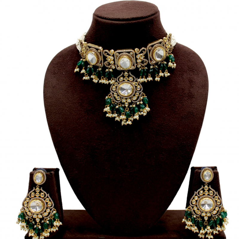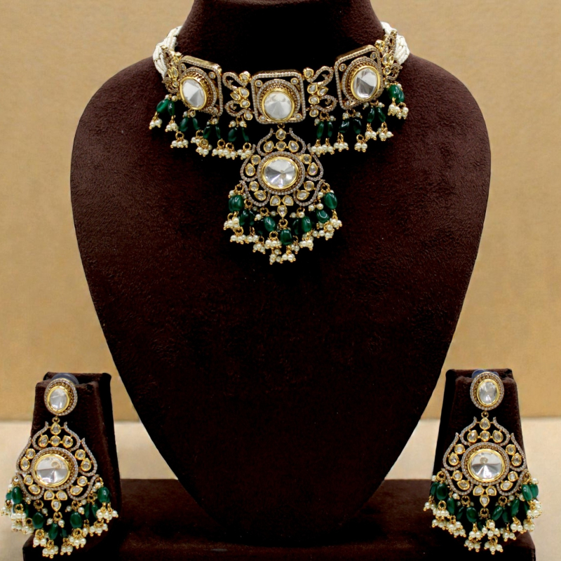 The combination of white polki stones, deep green beads, and antique gold polish gives this set a majestic Mughal-inspired charm, perfect for bridal wear.