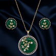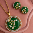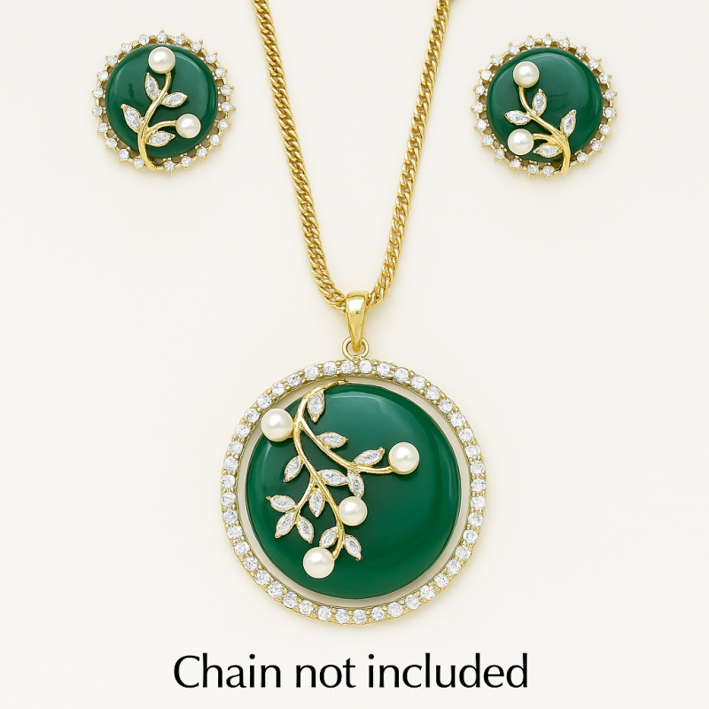 Add a touch of natural elegance to your collection with this exquisite pendant and earring set. The design features a deep emerald green circular base, artistically adorned with delicate golden branches and leaves embellished with sparkling American Diamonds (CZ). The design is further enhanced with luminous pearls that add a soft, timeless charm.