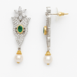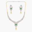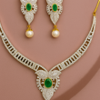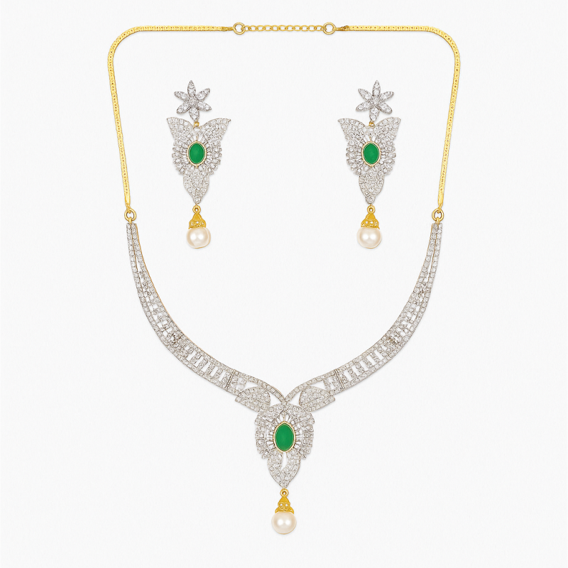 This elegant necklace set showcases a timeless design with a sparkling silver-tone base, encrusted with shimmering American diamonds and highlighted by a rich green emerald centerpiece. The necklace features a graceful V-shaped pattern that narrows into a marquise-cut emerald surrounded by intricate stonework, finished with a single pearl drop for a classic touch. The matching earrings mirror the necklace design, each embellished with emerald accents and finished with pearl drops, making them ideal for festive occasions or evening wear. The combination of emerald green, pearl white, and diamond-like brilliance creates a sophisticated yet versatile look that complements both traditional and modern outfits.