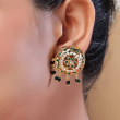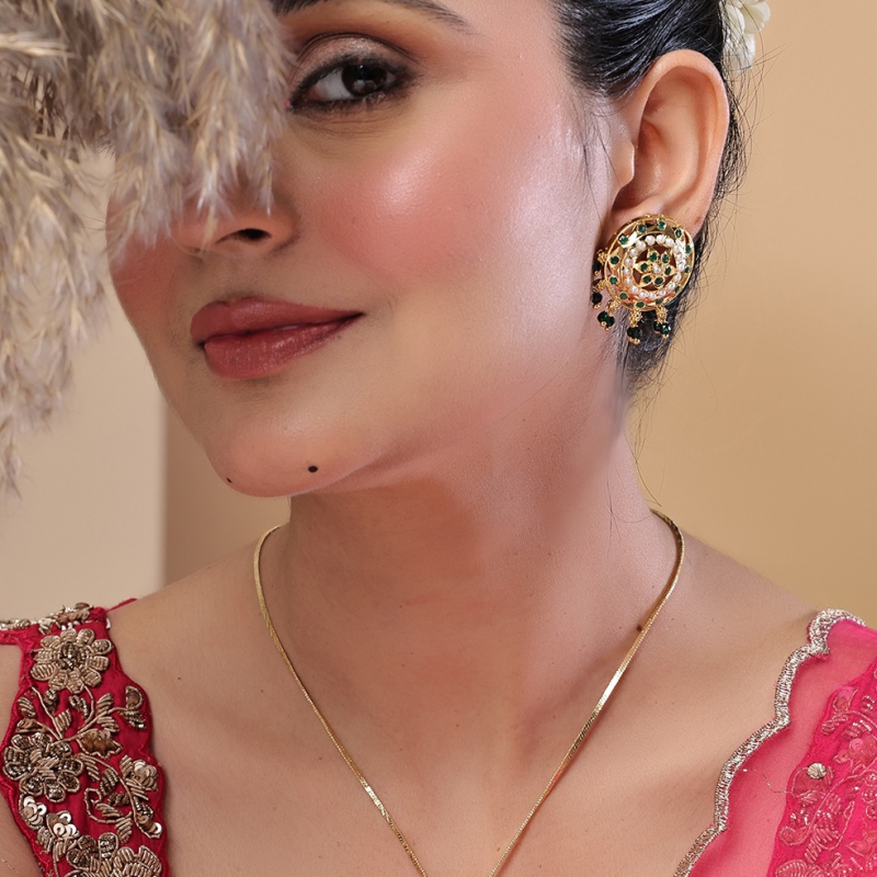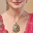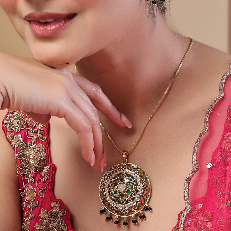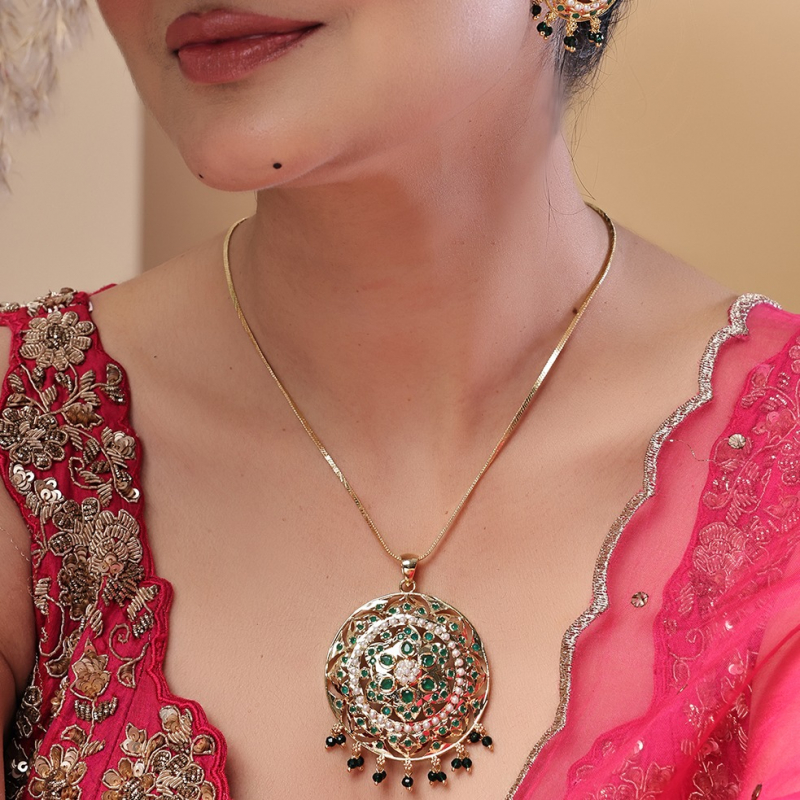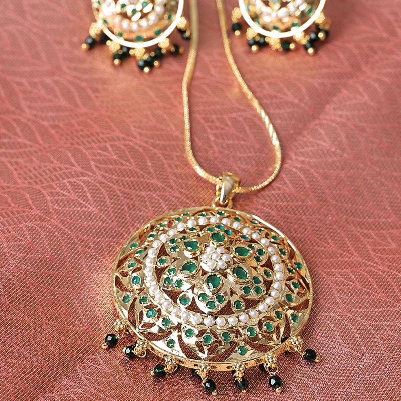 Enhance your ethnic look with this exquisite gold-toned pendant set, featuring intricate filigree craftsmanship and a stunning circular design. Adorned with elegant white pearls and vibrant green stones, the pendant and matching earrings showcase a floral-inspired pattern. The delicate black bead drops add a graceful finishing touch, making this set perfect for festive occasions and traditional wear.