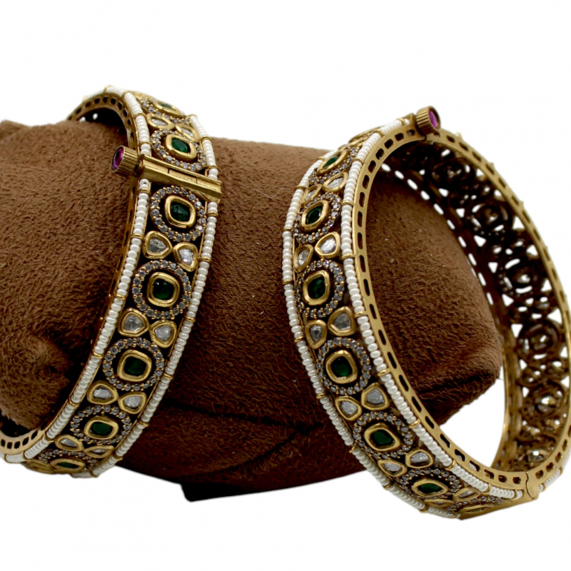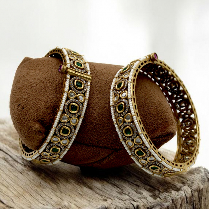 Add a regal charm to your traditional collection with these beautifully handcrafted emerald kundan kada bangles. Designed with alternating oval green stones and teardrop-shaped clear kundan stones, the bangles are elegantly framed with delicate ivory pearl lining on both sides. The antique gold polish enhances the richness of the green stones, giving a luxurious bridal appeal. Perfect for weddings, festive occasions, and special celebrations, these bangles offer a bold yet graceful statement look.