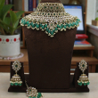 The beautifully arranged green bead drops and delicate pearl clusters along the border add movement and grandeur, making it a perfect statement piece for brides. This complete jewellery set includes a heavy choker necklace, matching jhumka earrings, and a coordinated maang tikka for a fully styled traditional appearance.