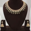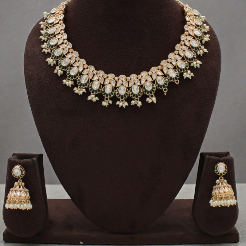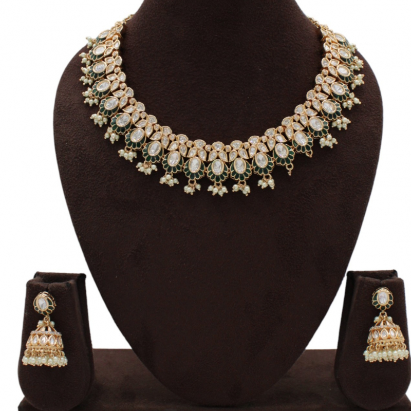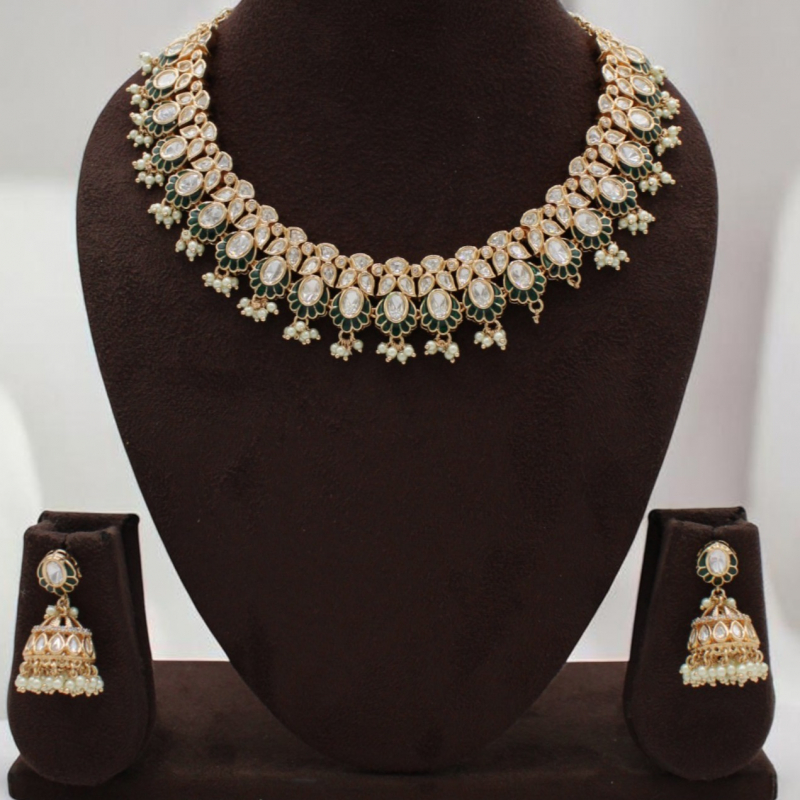 Elevate your traditional look with this beautifully crafted Kundan necklace set featuring elegant teardrop motifs framed with subtle green enamel detailing. The necklace showcases a continuous pattern of pear-shaped Kundan stones bordered with delicate green petal accents, finished with tiny pearl drop hangings that add graceful movement. Paired with matching dome-shaped jhumka earrings adorned with pearls, this set blends royal charm with timeless sophistication.