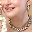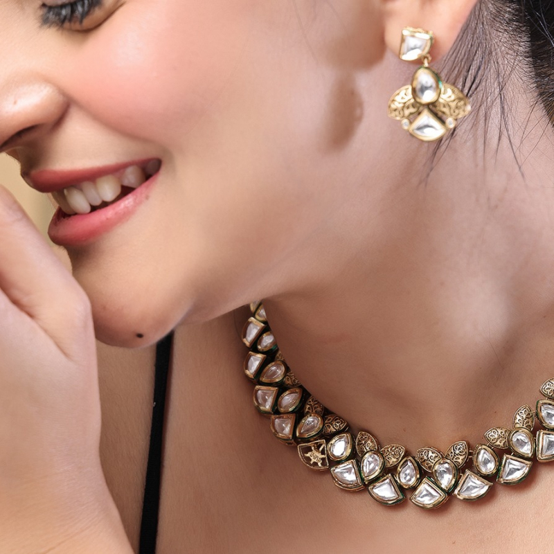 Add subtle elegance to your look with this emerald green slim choker set, designed with a delicate Polki-inspired finish. The choker features rich emerald-toned stones beautifully paired with sparkling white stones, creating a graceful and balanced contrast. Its lightweight and sleek design makes it perfect for those who prefer minimal yet statement jewelry without a heavy feel. Crafted with fine detailing and a refined gold polish, this set sits comfortably on the neckline, enhancing both traditional and modern outfits. Paired with matching earrings, it is ideal for festive occasions, small gatherings, and elegant celebrations, offering timeless charm and sophistication.