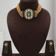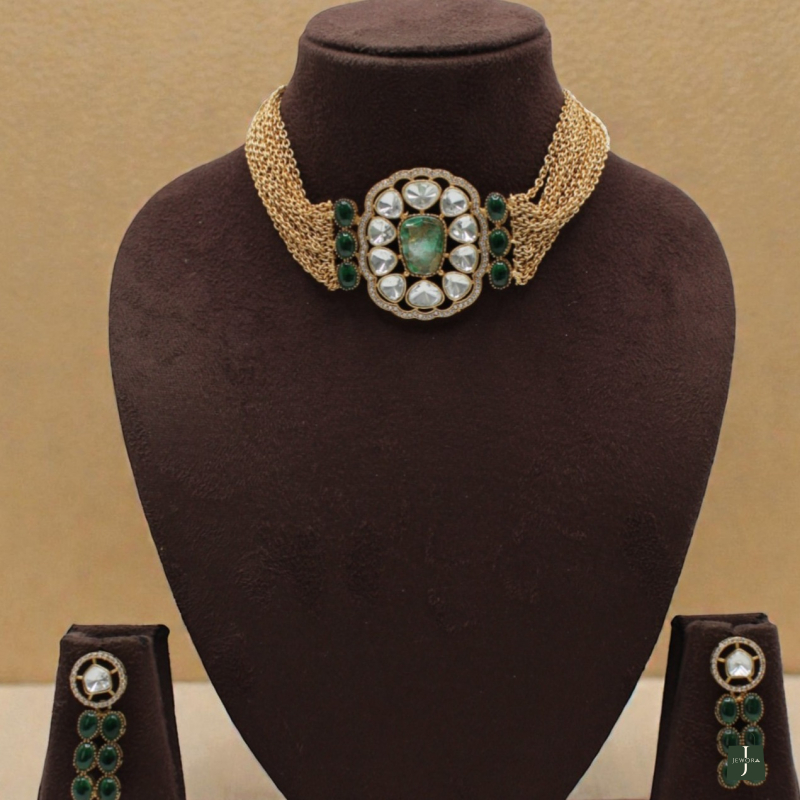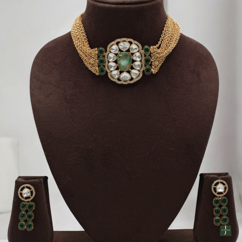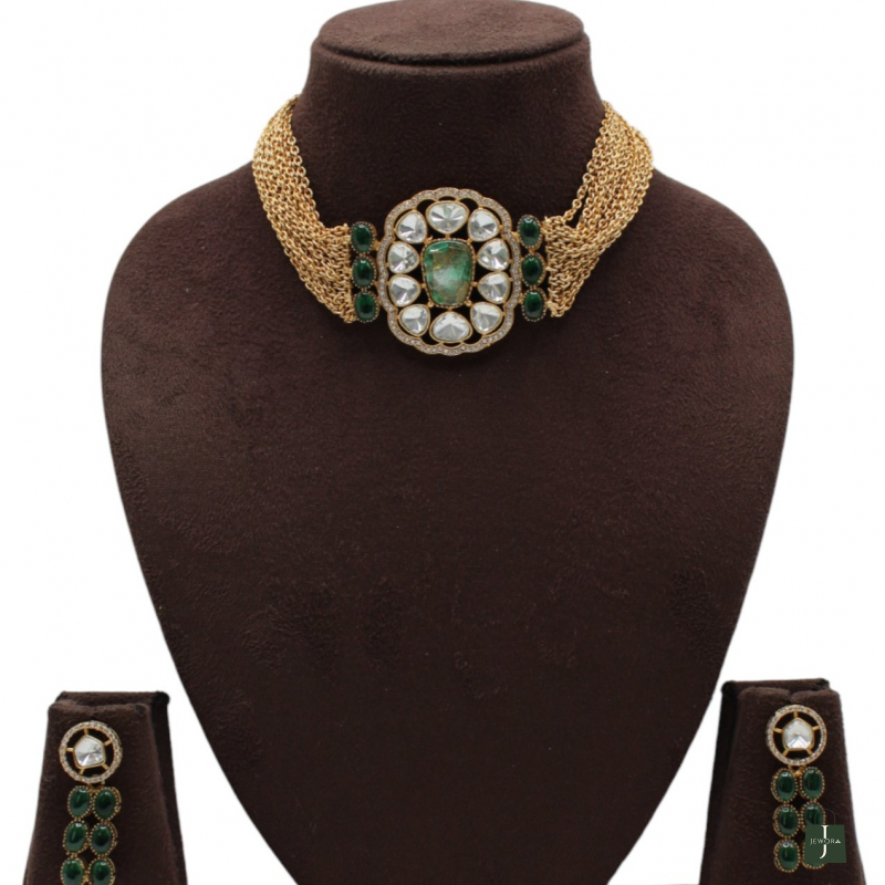 Elevate your festive and bridal styling with this luxurious emerald polki choker set. Designed with multiple layered gold-toned chains, the necklace features a bold oval centerpiece adorned with uncut polki-style stones and a striking emerald green center stone. The side detailing with green accents enhances its regal appeal.