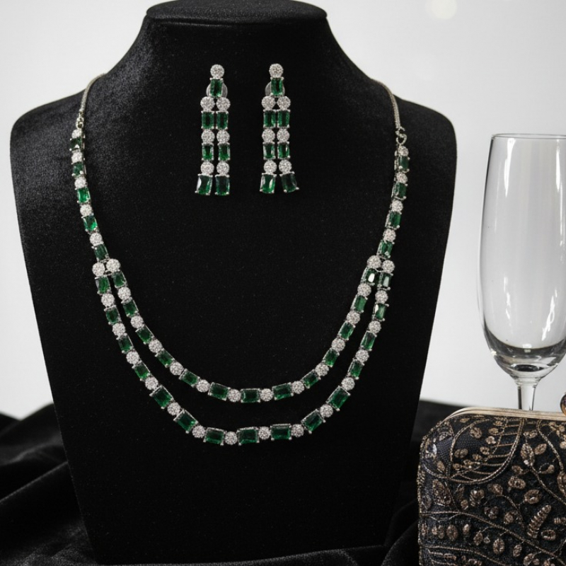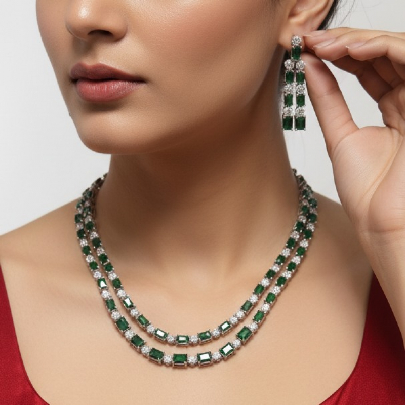 Make a bold yet refined statement with this exquisite double-layer emerald necklace set. Designed with precisely cut rectangular emerald-green stones framed by sparkling American Diamonds, the necklace features a sleek, symmetrical pattern that beautifully enhances the neckline. The matching vertical drop earrings mirror the same emerald and diamond alignment, creating a modern, luxurious look. Perfect for cocktail evenings, wedding receptions, and grand celebrations, this set adds timeless sophistication to any attire.