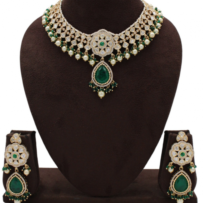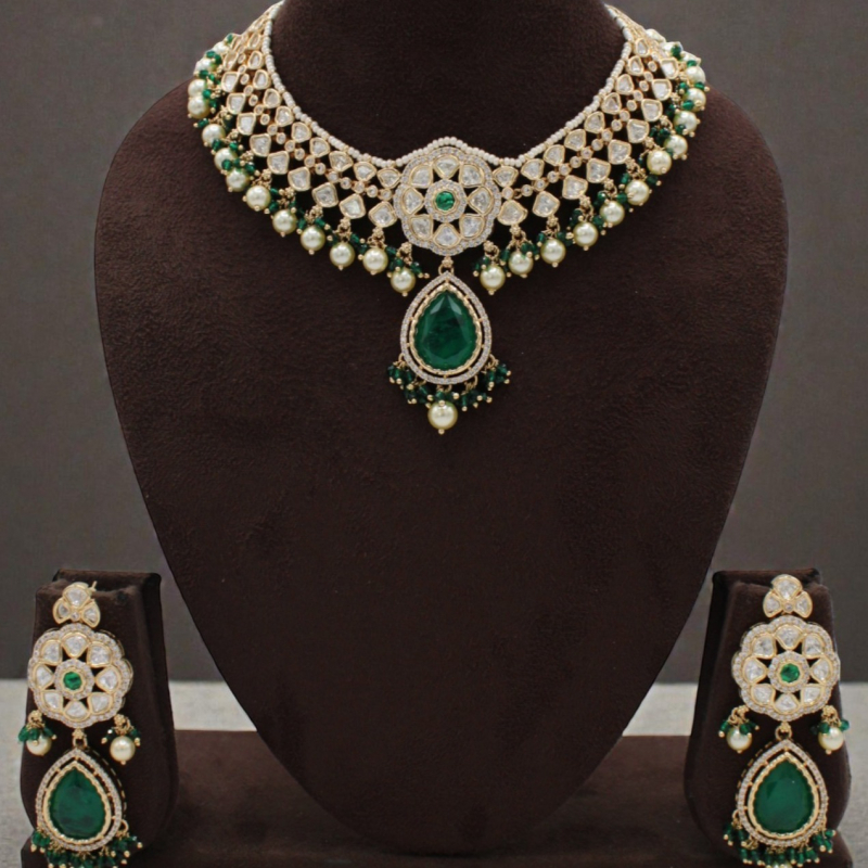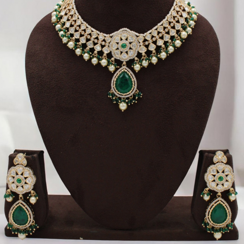 Grace your special occasions with this luxurious Kundan necklace set featuring intricate white Kundan work highlighted by rich emerald green stones. The design showcases a beautifully crafted circular floral centerpiece connected to a striking pear-shaped emerald drop pendant. Pearl hangings and green bead accents add elegance and graceful movement. Paired with matching long earrings, this set exudes royal charm and timeless sophistication.