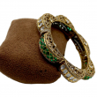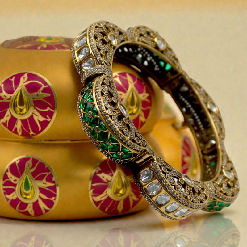 Add royal elegance to your traditional collection with this beautifully crafted Rajwadi-style kada. Designed in an antique gold finish, the bangle features intricate filigree work adorned with shimmering Kundan stones. The highlight is the oval centerpiece with green lattice stone detailing, adding richness and heritage charm. Perfect for festive and wedding wear, this kada makes a bold yet graceful statemen