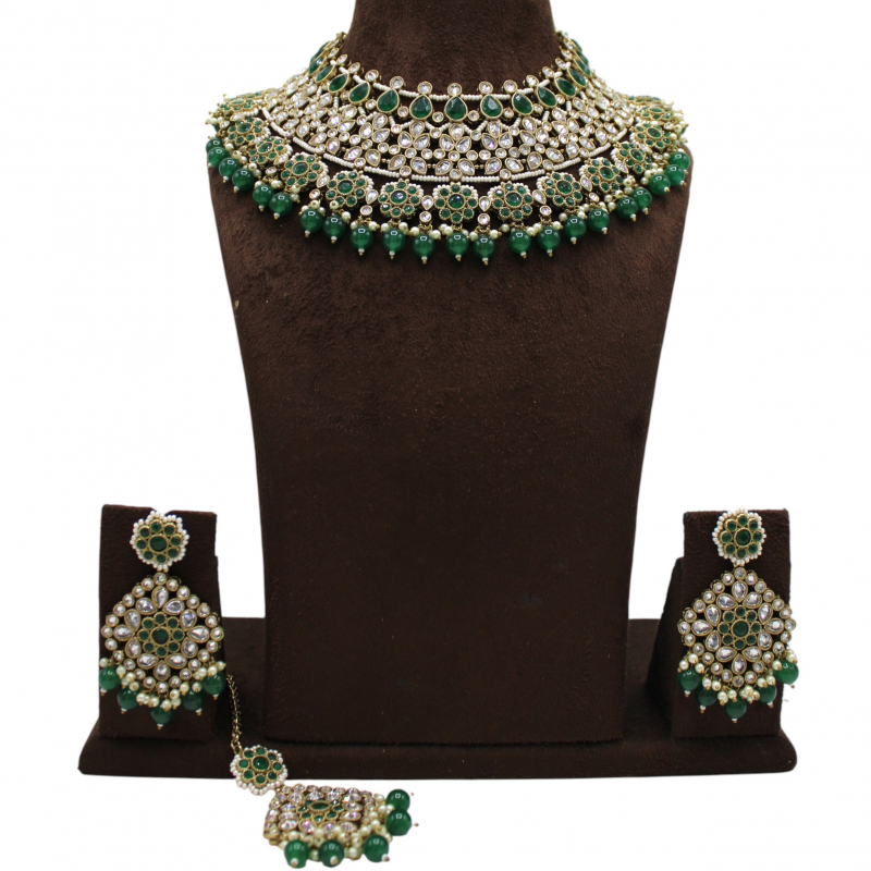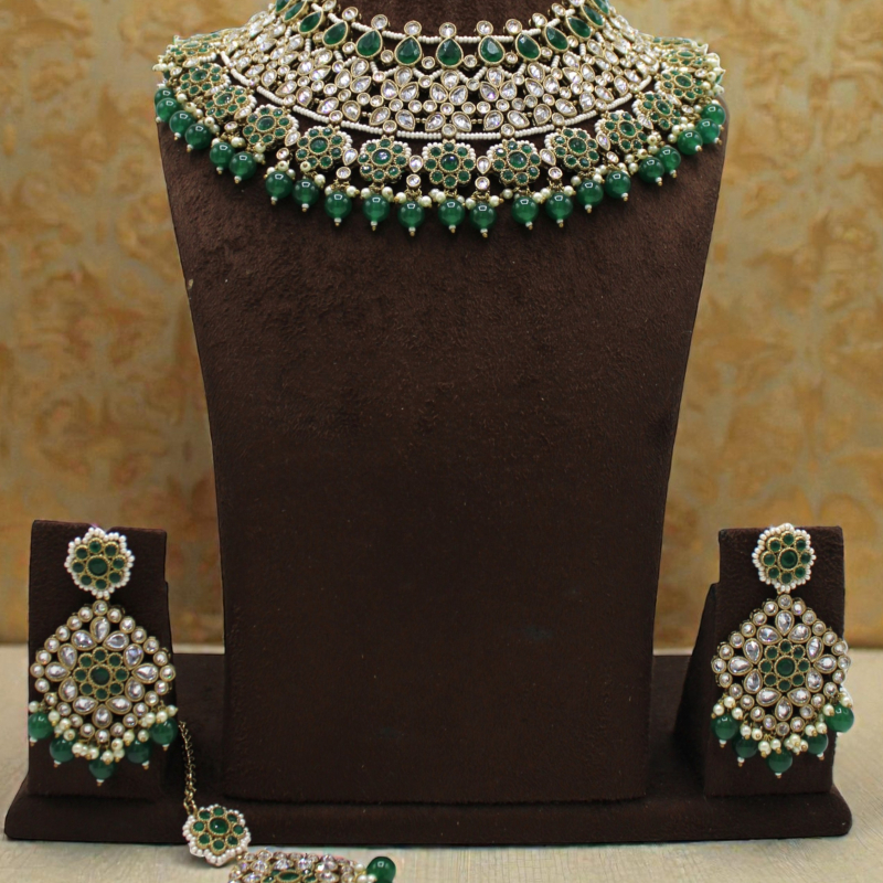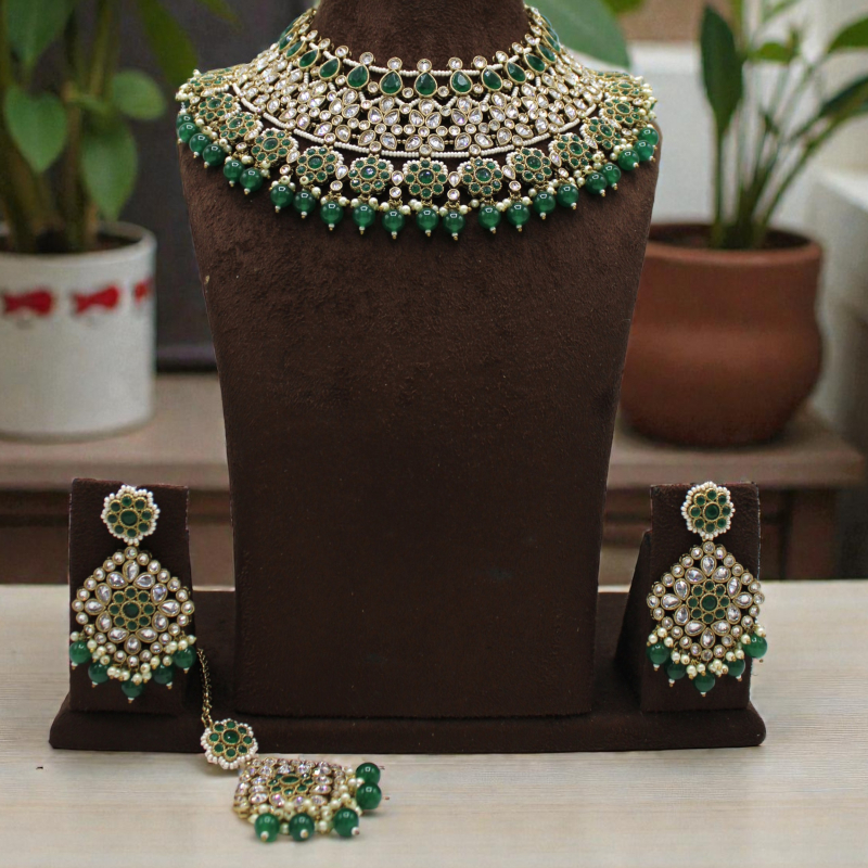 Make a majestic statement with this exquisite emerald bridal choker set crafted in intricate Kundan artistry. The layered choker features rows of shimmering white Kundan stones highlighted with elegant green teardrop accents. The lower edge is beautifully finished with green bead drops and delicate pearl detailing, adding graceful movement and richness. Paired with matching chandelier-style earrings and a coordinating maang tikka, this set is perfect for brides and grand festive celebrations.
