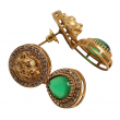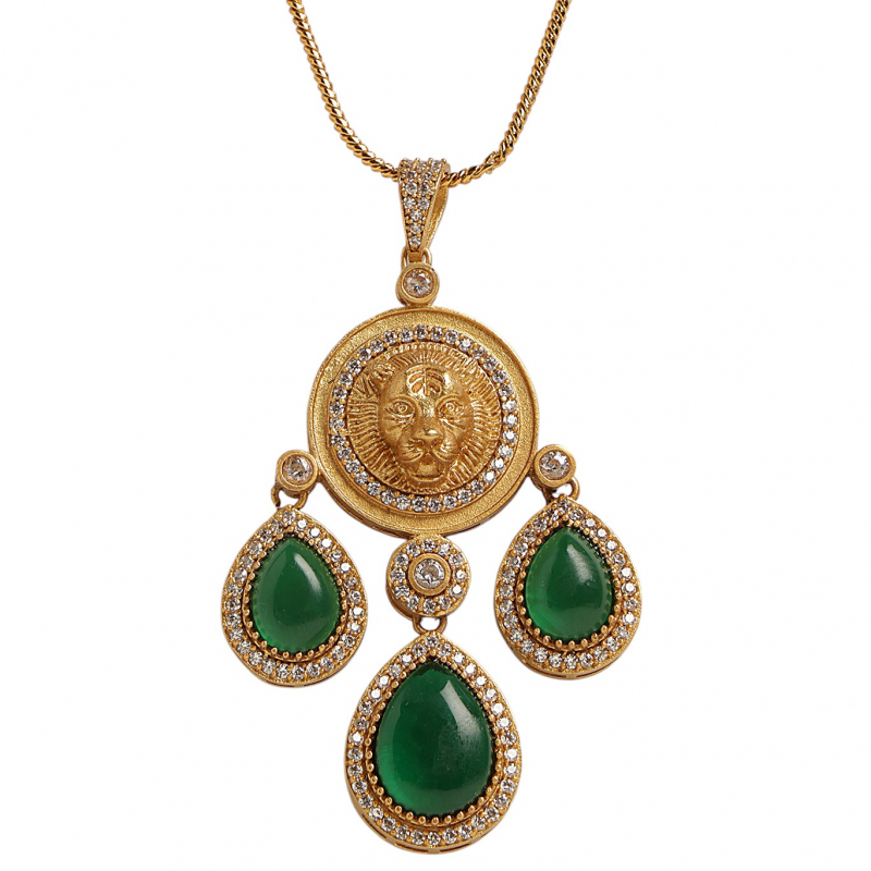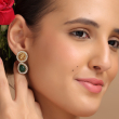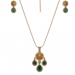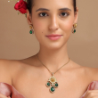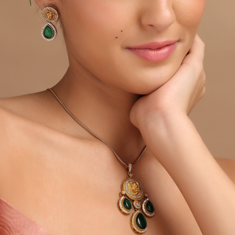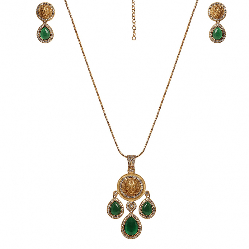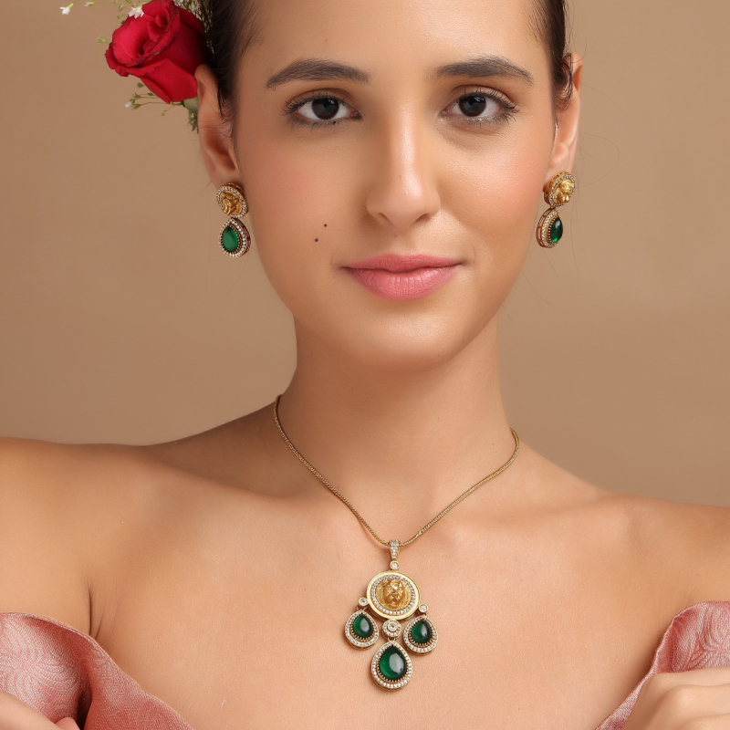 Add a regal touch to your jewelry collection with this stunning emerald royal kundan pendant set. Designed with a beautifully detailed gold-tone pendant featuring a central motif and accented with rich green teardrop stones, this piece reflects timeless elegance. The delicate chain enhances its grace, while the matching earrings complete the look. Perfect for festive occasions and special events, this set blends traditional charm with modern sophistication.