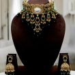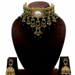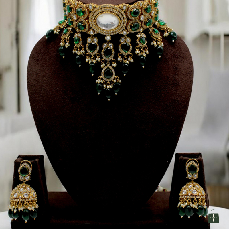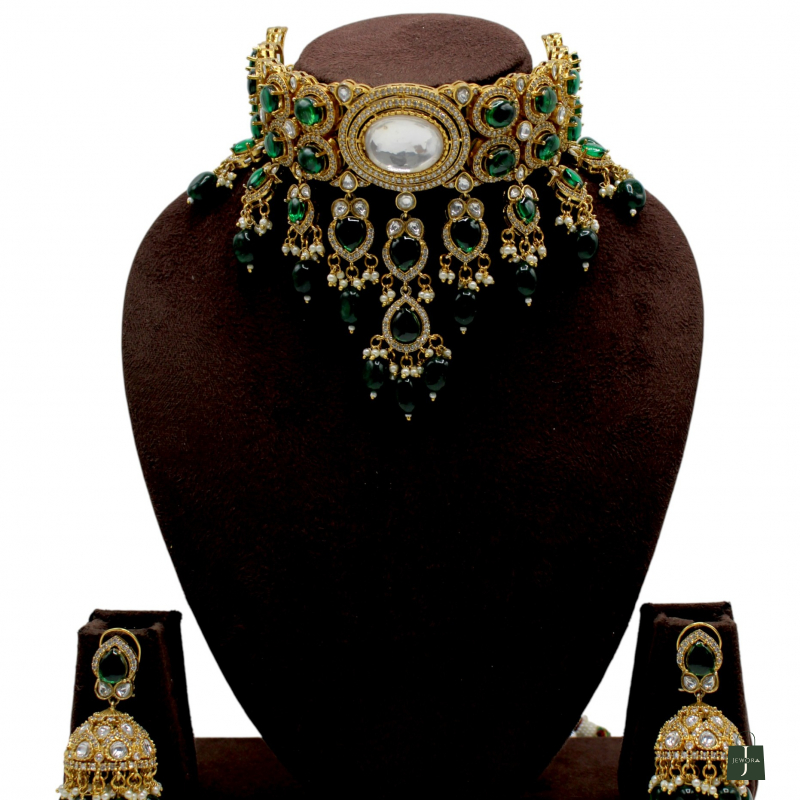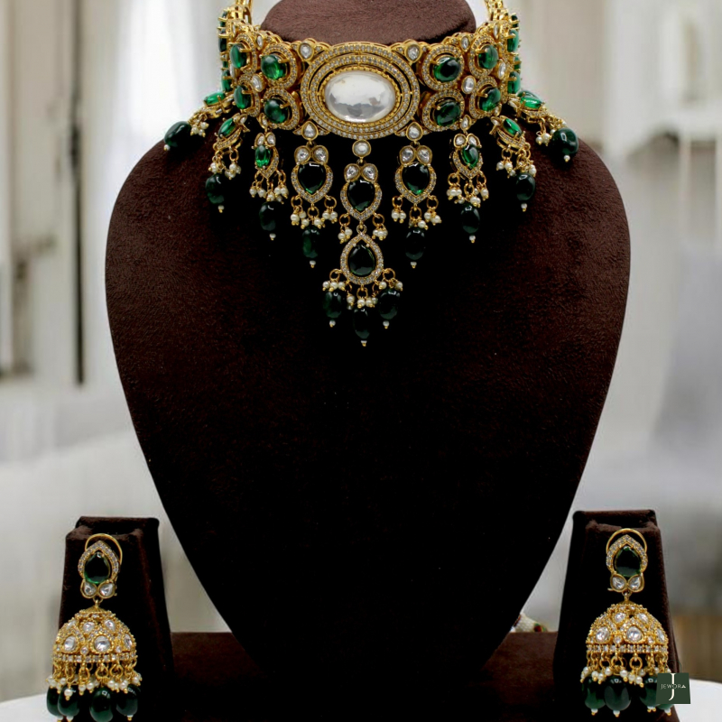 Turn heads with this magnificent Emerald Royal Polki Choker Set, crafted to give a luxurious and regal bridal look. The choker features a bold oval centerpiece surrounded by intricate Polki-style stone detailing and vibrant emerald-green stones set in antique gold polish.