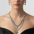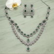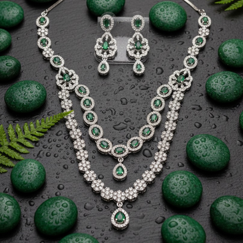 Grace your neckline with timeless elegance in this beautifully crafted double-layer emerald necklace set. The upper layer features oval emerald-green stones framed with shimmering American Diamonds, while the lower layer showcases delicate clustered diamond-style detailing finished with a pear-shaped green drop pendant. The matching drop earrings echo the same intricate halo and teardrop design, creating a perfectly coordinated look. Ideal for weddings, festive celebrations, and evening occasions, this set adds royal charm and sophistication to any outfit.