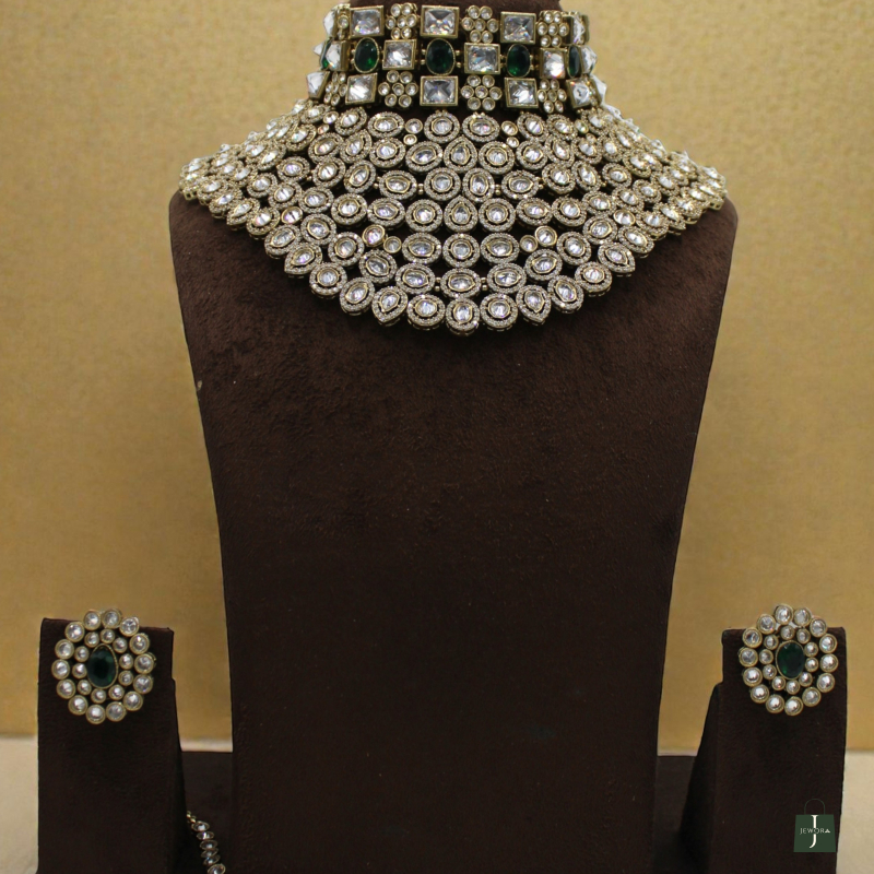 Elevate your bridal look with this luxurious Emerald Royale Kundan Bridal Choker Set, designed to reflect timeless royal charm. This exquisite jewellery set features a heavily layered choker adorned with premium Polki-style stones and rich emerald-green accents that create a regal and sophisticated appeal.