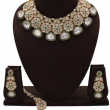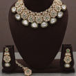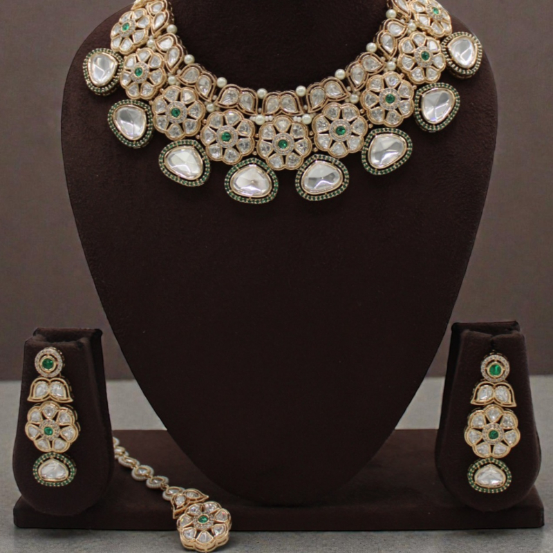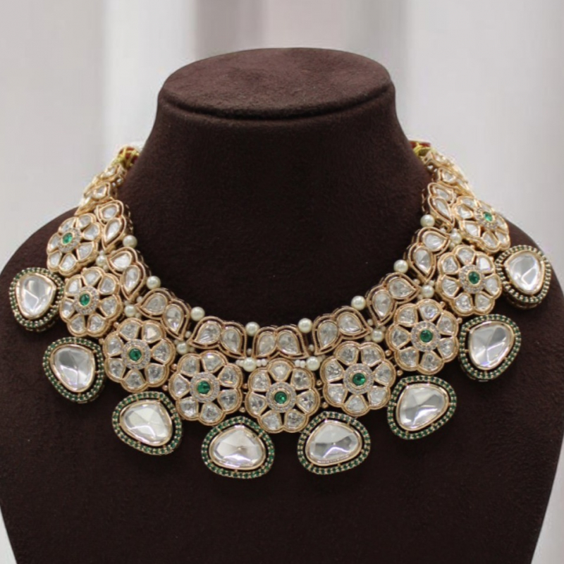 Exude royal elegance with this stunning Kundan choker necklace set, crafted with intricate floral motifs and highlighted with rich emerald-green accents. The design features traditional uncut Kundan stones beautifully arranged in layered floral patterns, complemented by teardrop-shaped stones and delicate pearl detailing.