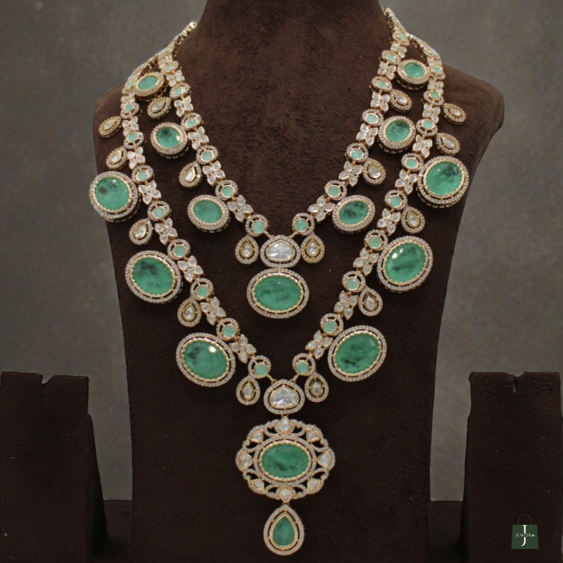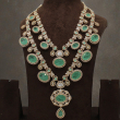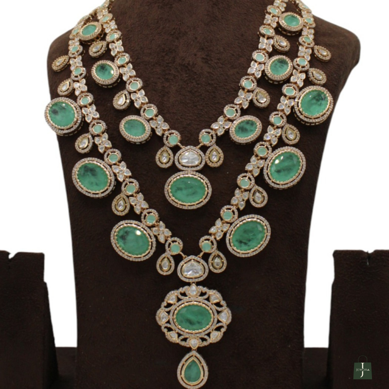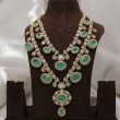 Make a grand statement with this exquisite multi-layer bridal necklace set, designed with vibrant emerald-green stones and sparkling Kundan detailing. The necklace features three beautifully layered strands adorned with oval and teardrop-shaped green stones, surrounded by fine white Kundan accents.