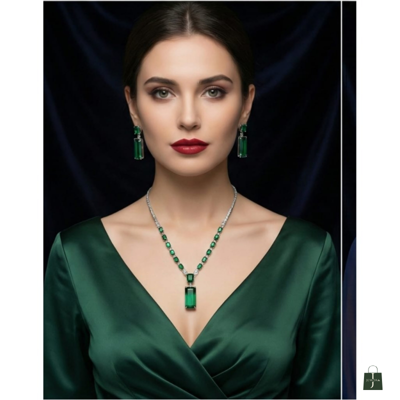 Elevate your elegance with the Emerald Royale Pendant Necklace & Earring Set, a timeless masterpiece crafted for those who appreciate luxury and grace. Featuring radiant emerald-green stones set in a sleek silver-tone finish, this exquisite set includes a statement rectangular pendant necklace paired with matching drop earrings.