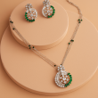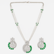 The Emerald Spiral Necklace Set showcases a dazzling spiral pendant and earrings design, embellished with American Diamond (CZ) stones and bordered with radiant emerald accents. The layered silver-polished chain enhances the elegance, making it a graceful pick for festive and party occasions.