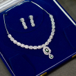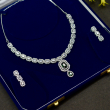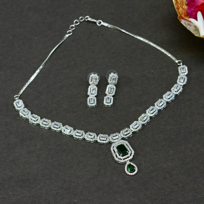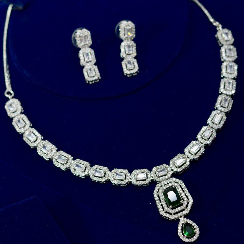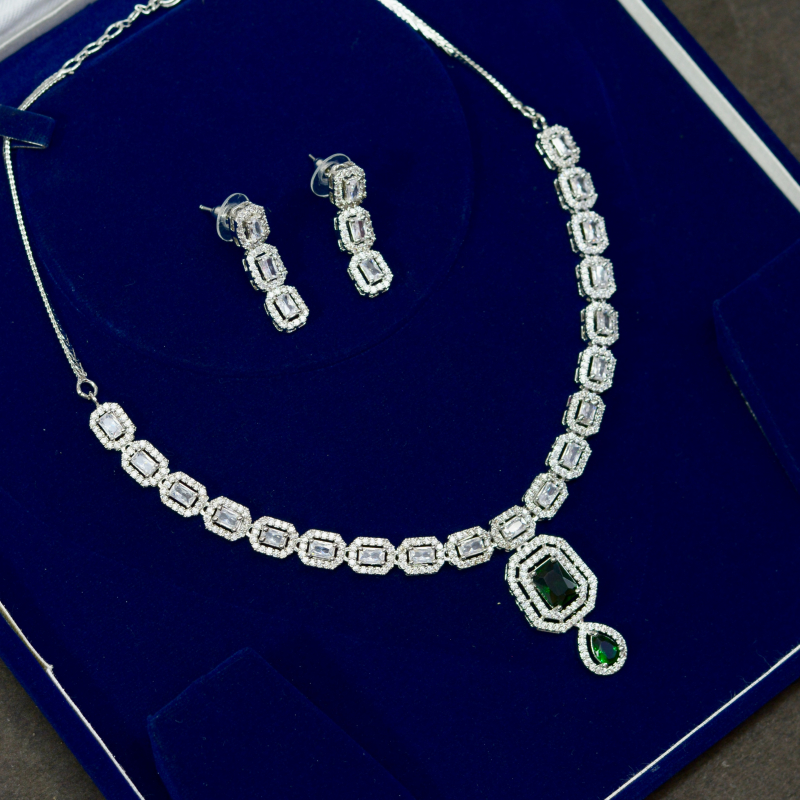 This Emerald Square Drop Necklace Set showcases precision-cut square stones accented with delicate crystal framing. The modern yet elegant design enhances its premium appeal, making it a versatile choice for celebrations, evening wear, and gifting while remaining lightweight and affordable.