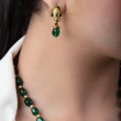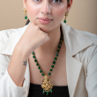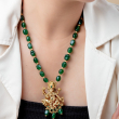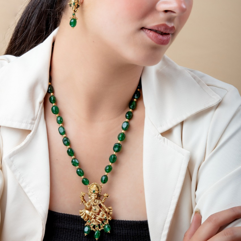 The jewelry is a traditional necklace set featuring rich green beads and a gold-toned pendant with intricate detailing.Lord Ganesha