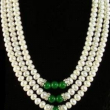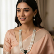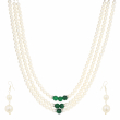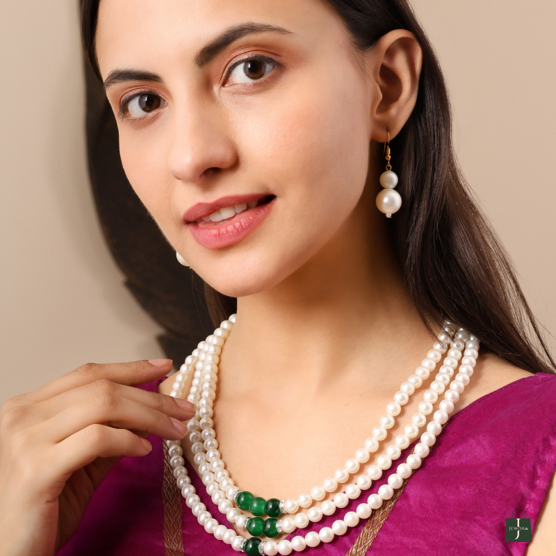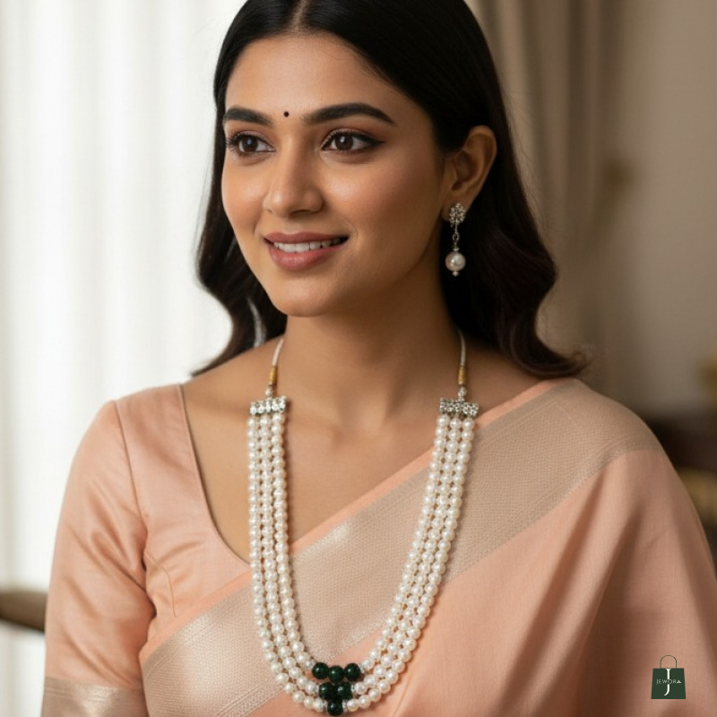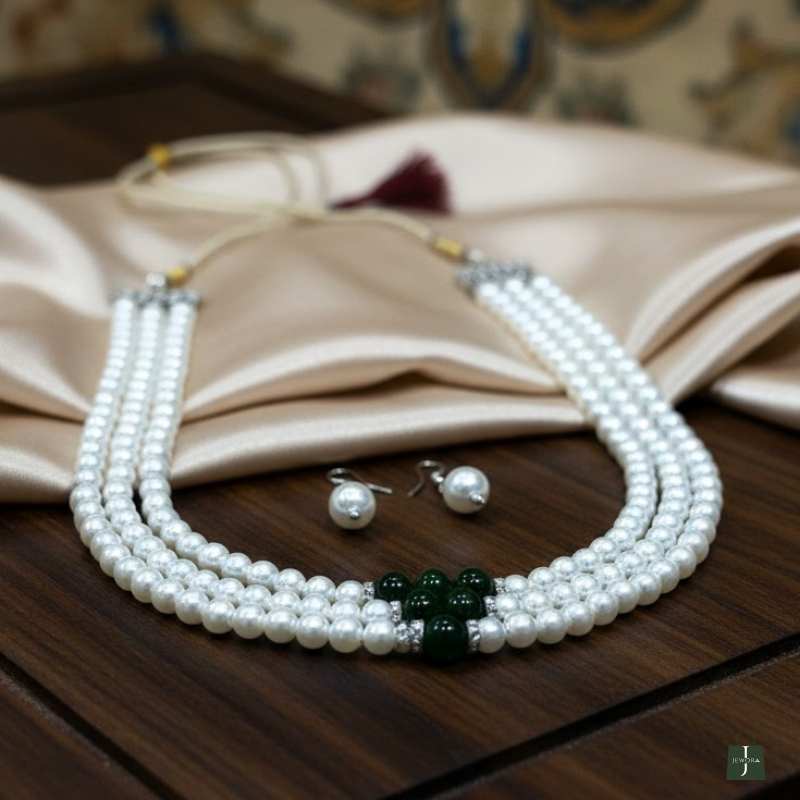 The Emerald Touch Triple Layer Pearl Necklace Set is a graceful blend of traditional elegance and modern charm. Designed with three layers of premium quality ivory white synthetic pearls, this necklace features a beautiful cluster of emerald green beads at the center, adding a rich and royal touch to the overall look. The pearls are perfectly round with a smooth glossy finish, making the necklace look luxurious and refined.