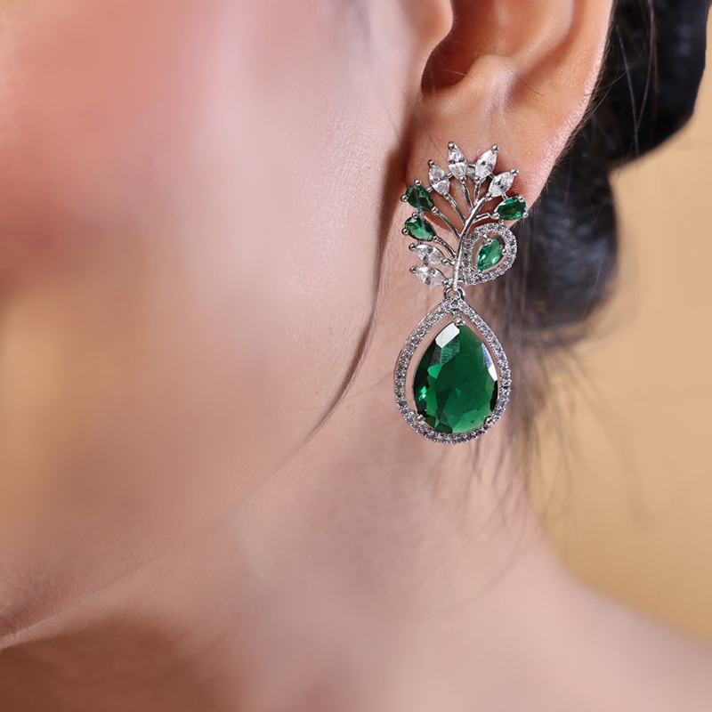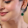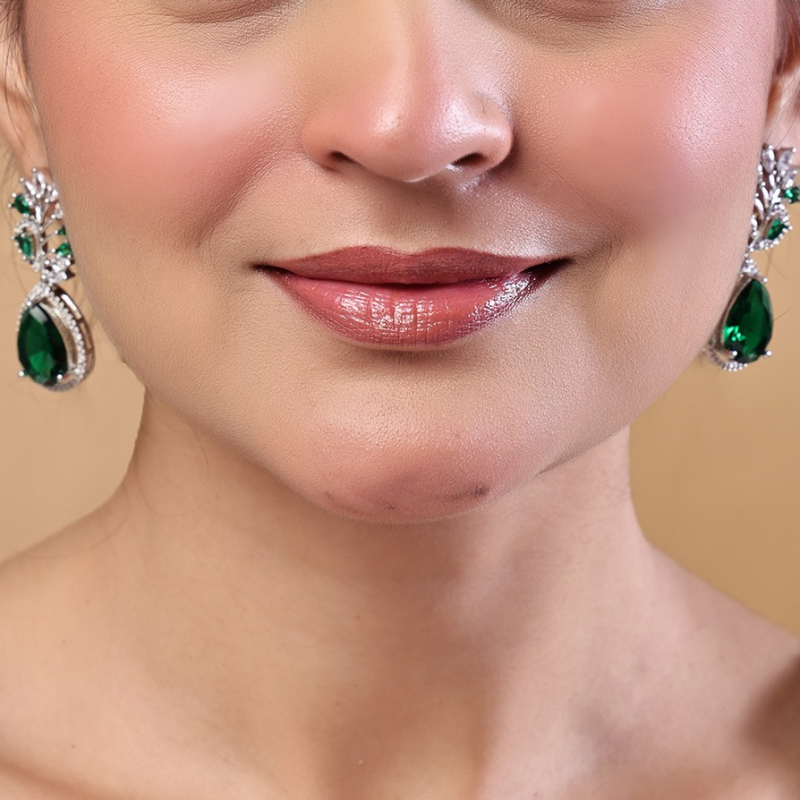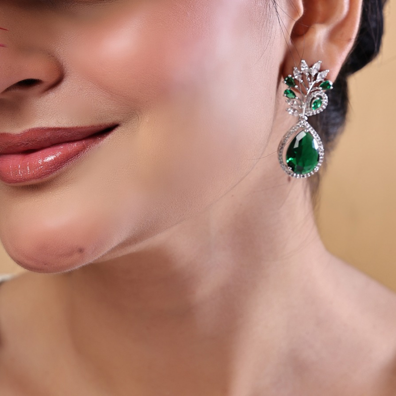 The Emerald Whisper Leaf Dangler Earrings are a stunning blend of elegance and nature-inspired design. Crafted with a sleek silver polish, these earrings feature a delicate leaf pattern that gracefully cascades in a drop style. Sparkling white diamond-like stones beautifully complement the rich emerald green centerpiece, creating a radiant and eye-catching shine. Designed with a secure push-back closure, they ensure both comfort and stability for all-day wear. The intricate detailing and shimmering finish make them perfect for festive occasions, evening events, or adding a luxurious touch to everyday outfits. A truly timeless and unique accessory for modern elegance.