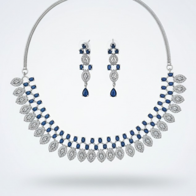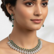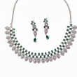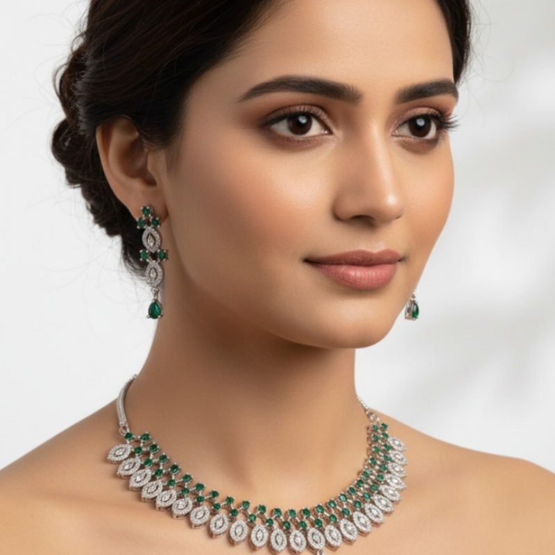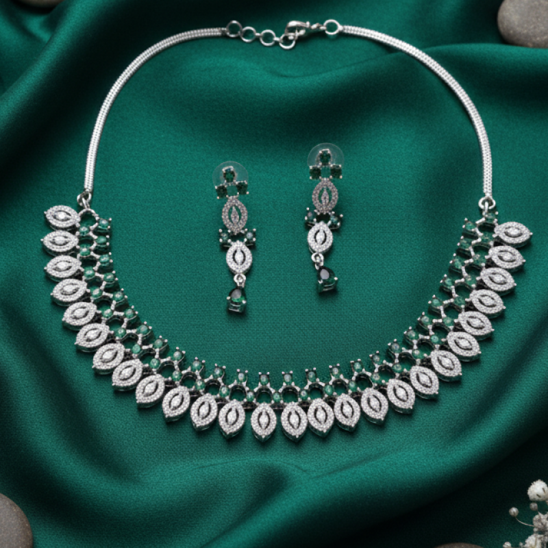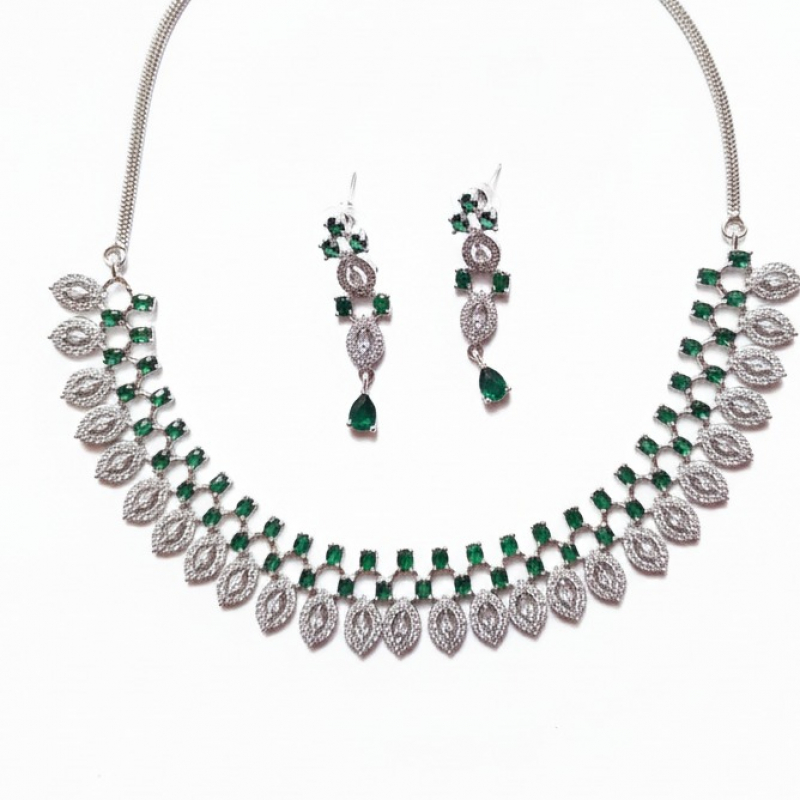 Elevate your elegance with the Emerelle Luxe Emerald Diamond Necklace Set. Designed in a refined silver-tone finish, this exquisite set features a graceful arrangement of marquise (leaf-shaped) diamond-like stones paired with vibrant emerald green accents. The necklace forms a delicate cascading pattern that sits beautifully along the neckline, while the matching drop earrings mirror the same leaf-inspired design for a coordinated and luxurious look.