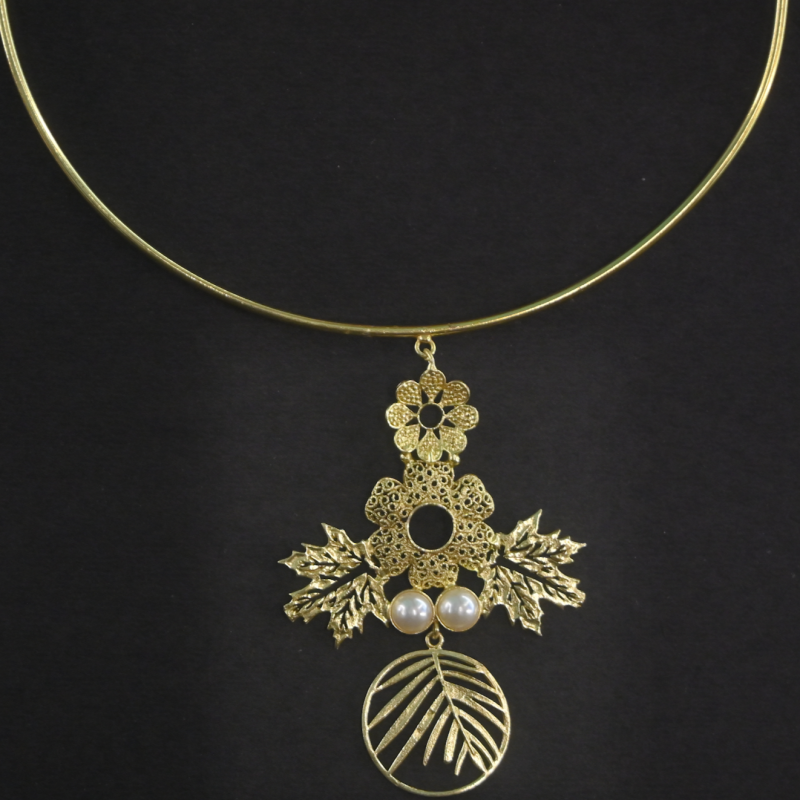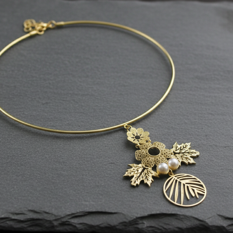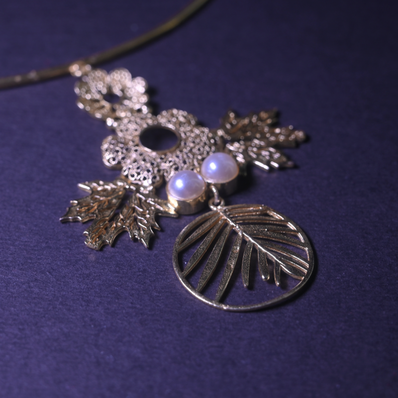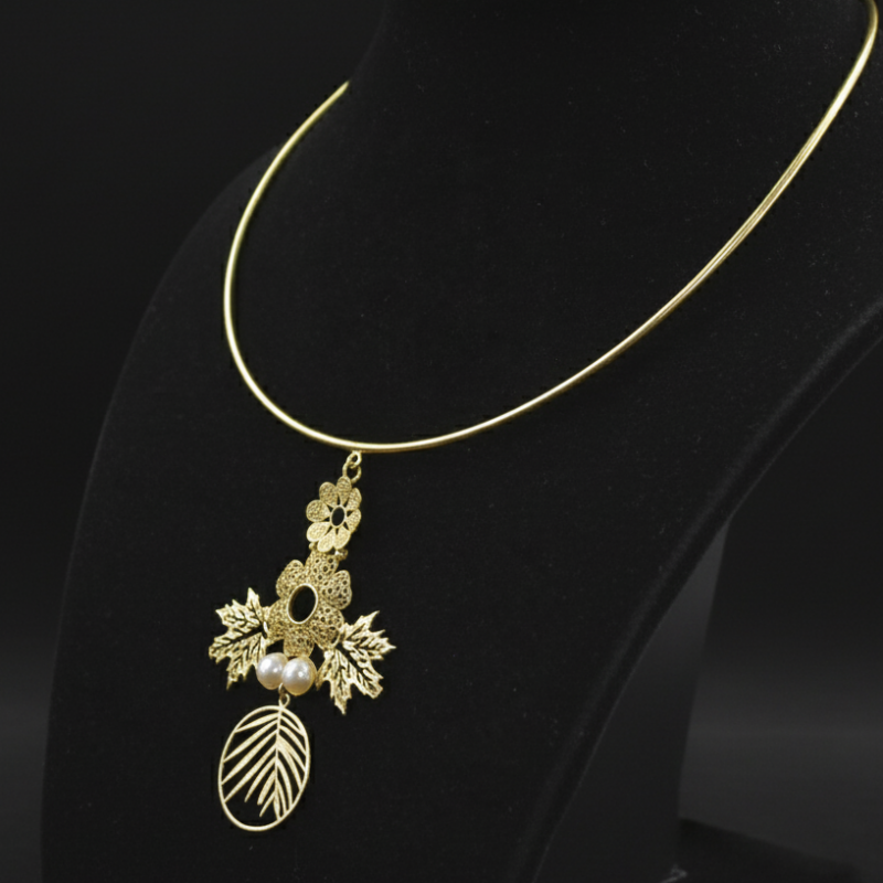 Designed with intricate floral motifs and finely textured leaf accents, the pendant beautifully blends botanical elegance with modern styling. A subtle black center detail adds contrast, while soft pearl accents enhance the feminine appeal. The circular leaf charm at the bottom completes the layered design with a graceful touch.