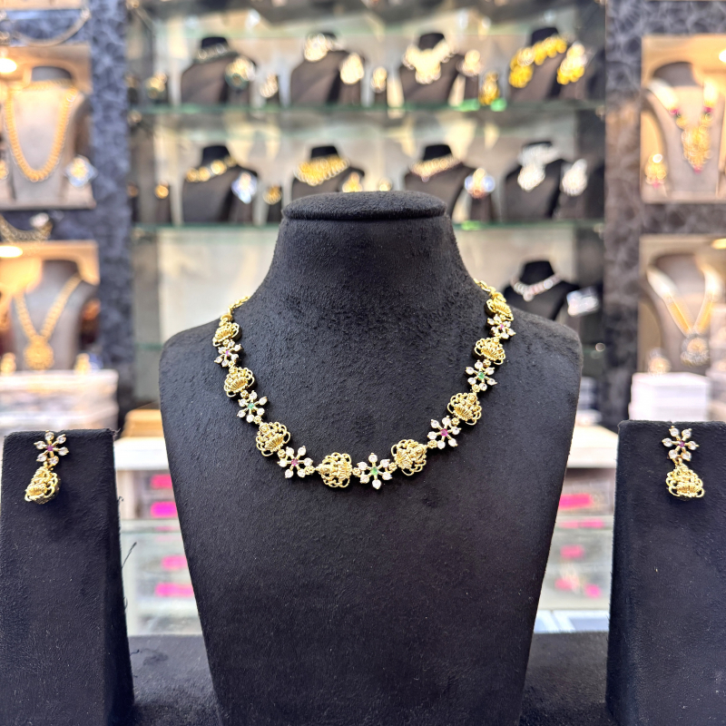 Elevate your ethnic elegance with the Eternal Blossom Temple Necklace Set from Jewora, crafted with divine artistry and traditional charm. This exquisite set showcases intricately carved temple motifs paired with floral-inspired designs, highlighted by multicolor gemstones and sparkling accents. The antique gold polish adds a regal touch, making it a timeless piece for festive occasions and weddings. Complete with a matching pair of earrings, this necklace set blends heritage craftsmanship with modern elegance, ensuring you shine with grace at every celebration.