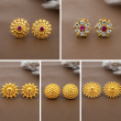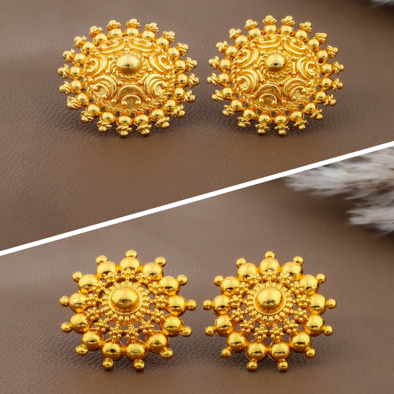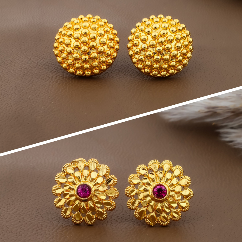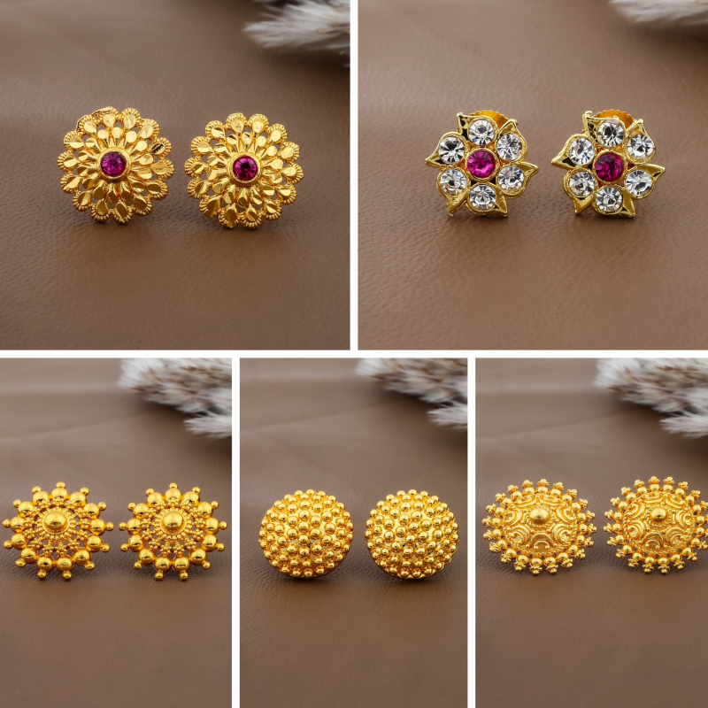 nhance your festive look with this beautiful gold stud earrings combo collection featuring six unique designs crafted with attention to detail. The earrings include floral motifs, textured circular patterns, and crystal-studded styles that create a balanced combination of elegance and charm.