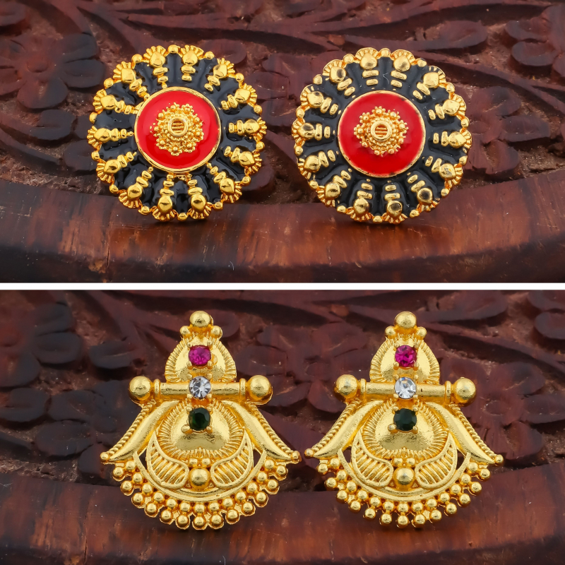This premium traditional earring combo set showcases the beauty of classic Indian jewellery design. Featuring six distinctive pairs, the collection blends heritage temple motifs, floral stone studs, and antique-style patterns. The elegant gold polish finish combined with colorful stones creates a luxurious and graceful appearance. Designed for comfort and style, these earrings are perfect for special occasions, festive celebrations, and elegant ethnic styling.