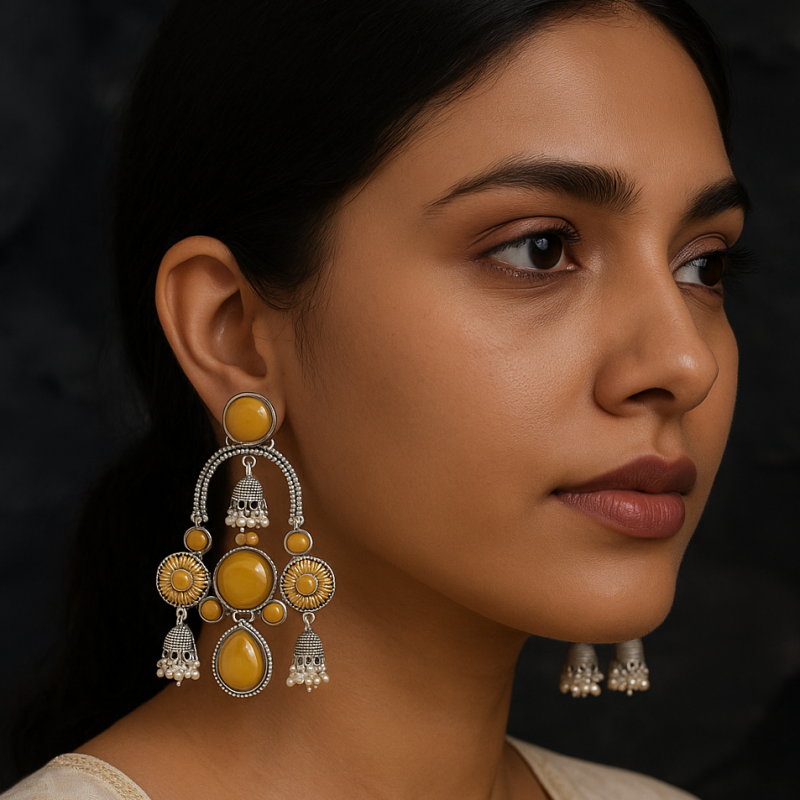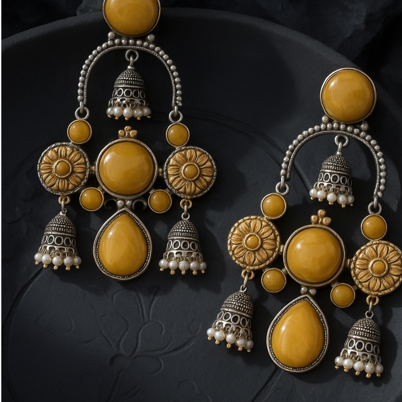 Dual tone Kundan Classic Jhumkas. This piece combines quality craftsmanship with a timeless design, making it perfect for any occasion. Elevate your style effortlessly and enjoy compliments on your refined taste. A must-have addition to your jewelry collection.