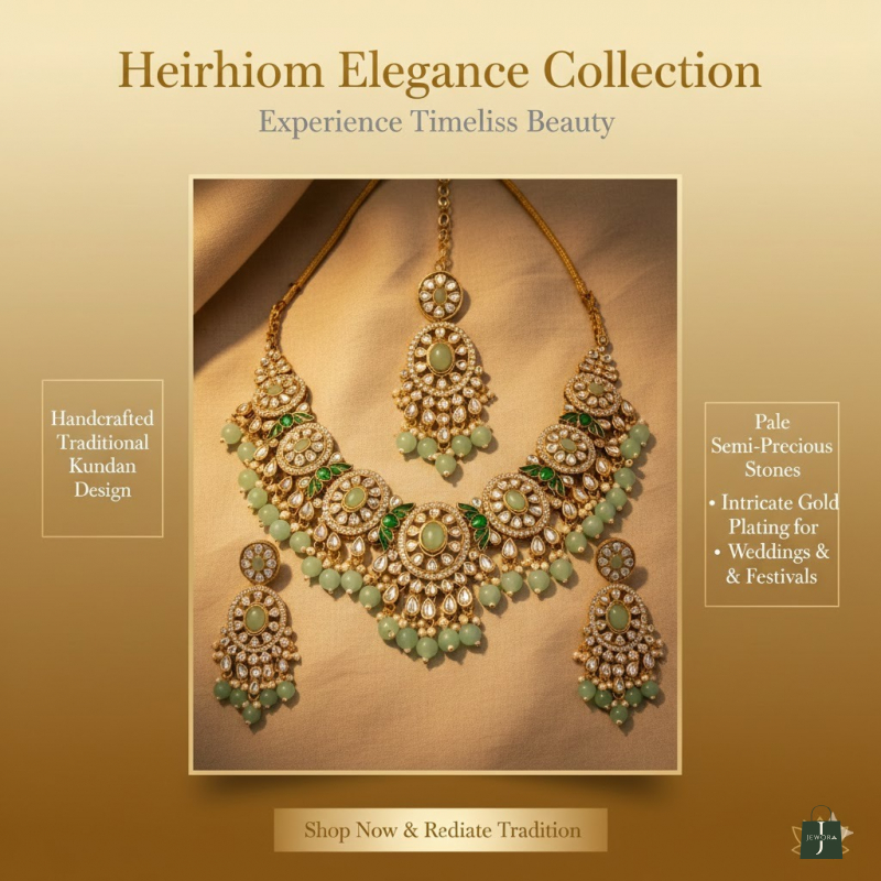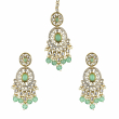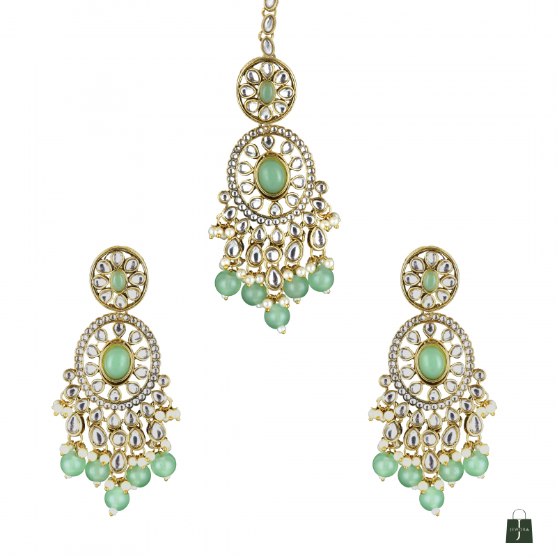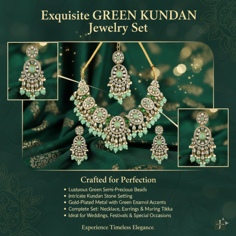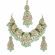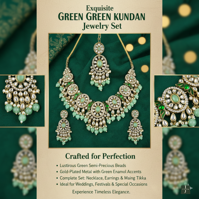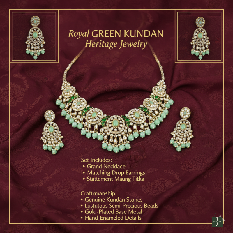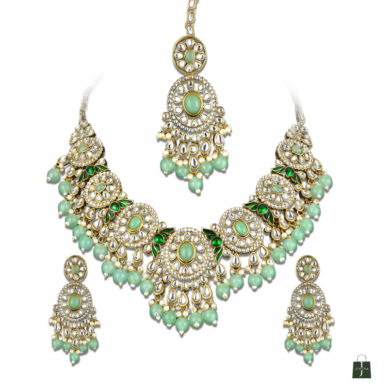 Complete 4-Piece Set: Includes 1 heavy choker necklace, 2 matching earrings, and 1 elegant Maang Tikka (headpiece) for a coordinated bridal look. Premium Craftsmanship: Features high-quality mint green beads, intricate Meenakari enamel work, and hand-set Kundan stones for a royal finish. Adjustable & Comfortable: The necklace features an adjustable thread (Dori) to fit any neck size perfectly. Lightweight earrings designed for long-wear comfort.