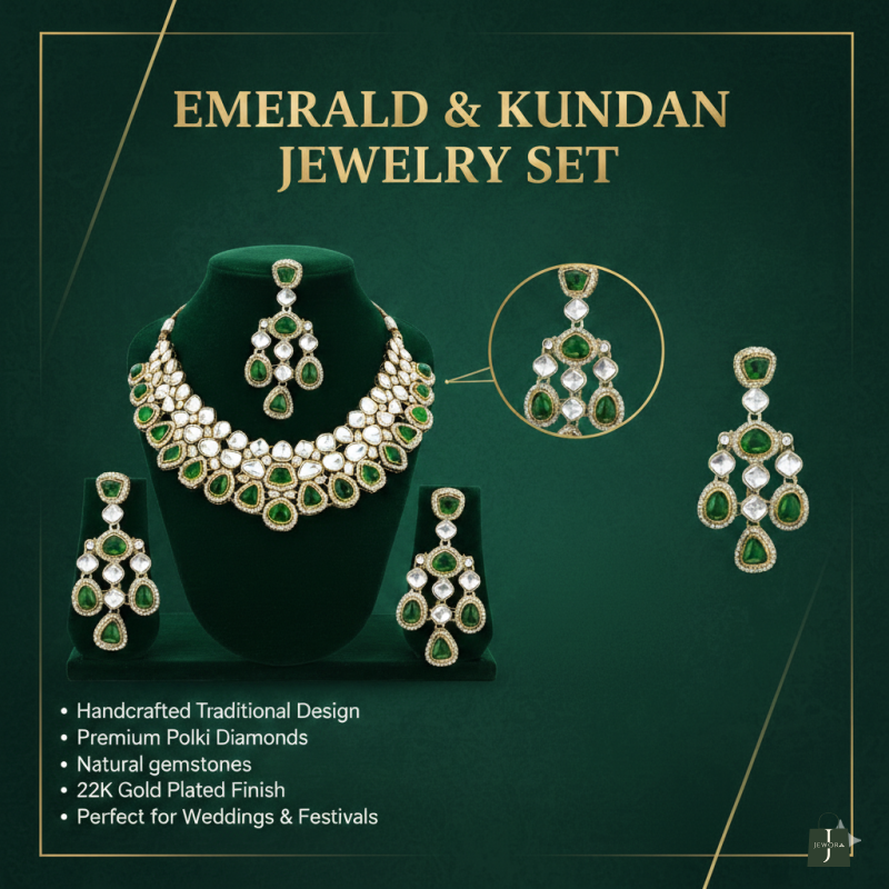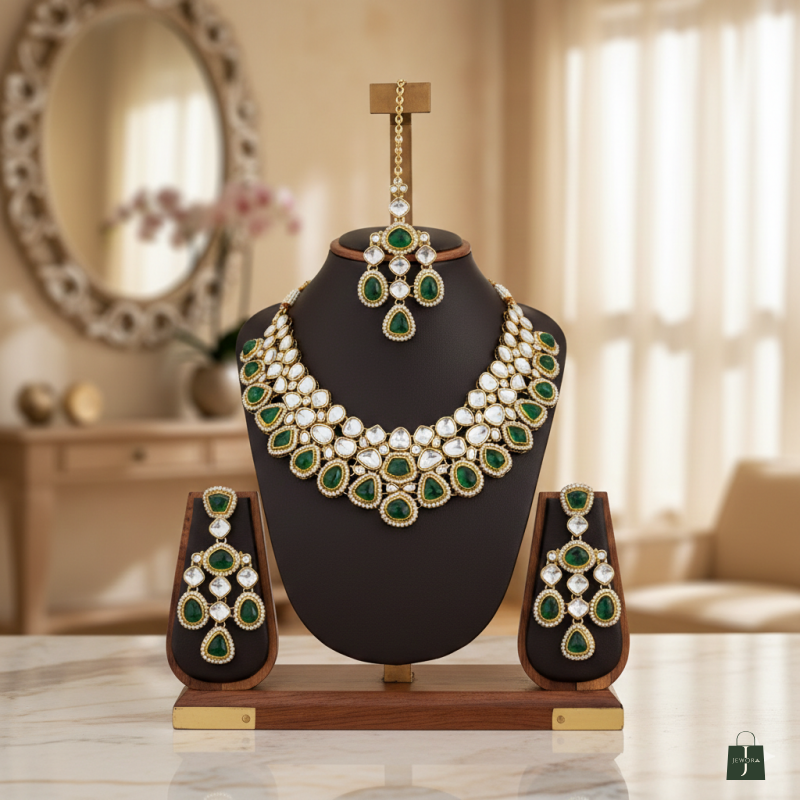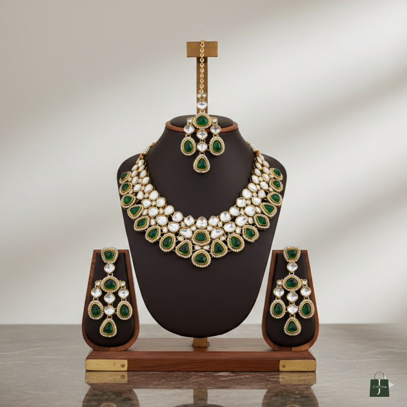 ✨ REGAL KUNDAN CRAFTSMANSHIP: Indulge in the timeless beauty of this handcrafted Kundan choker set. Featuring high-grade emerald green teardrop stones and precision-set clear polki-style crystals, this set captures the essence of royal Indian heritage. 🔱 COMPLETE 4-PIECE BRIDAL SUITE: This curated jewelry ensemble includes 1 intricately designed statement choker, a pair of matching heavy drop earrings, and a stunning Maang Tikka. A complete look designed to make you the center of attention at any event.