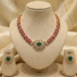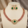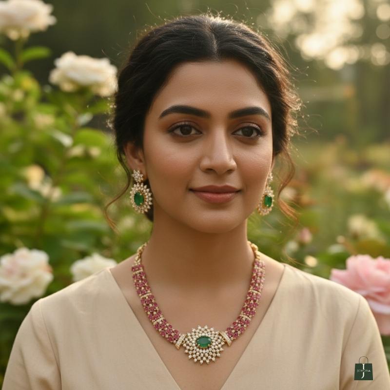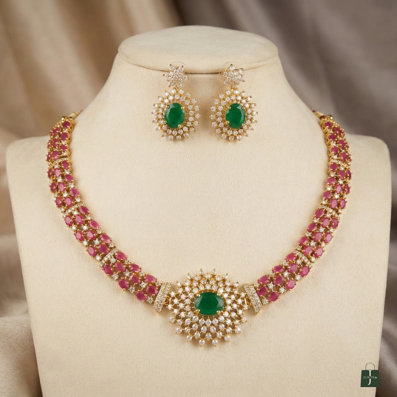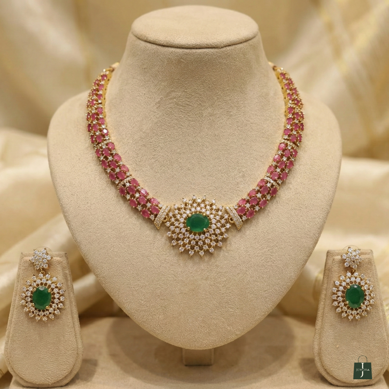 Color Palette: The dominant colors are vibrant pink/ruby and striking emerald green, accented by sparkling clear/white stones (likely cubic zirconia or American diamonds) set in a gold-tone base.