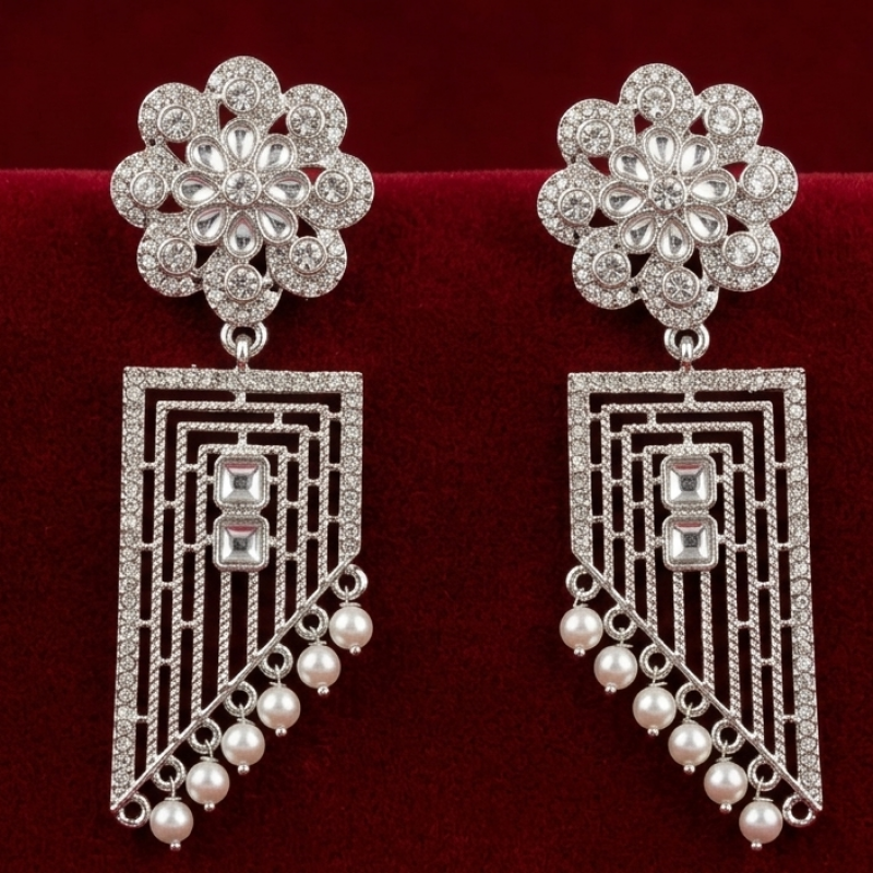 Elegant silver-toned dangler earrings featuring a sparkling floral stud topped with clear stones and a geometric rectangular pendant encrusted with stones and pearl tassels. Perfect for adding a touch of glamour to festive or evening outfits.