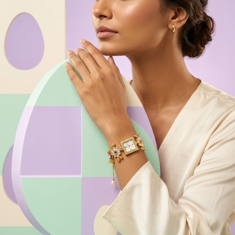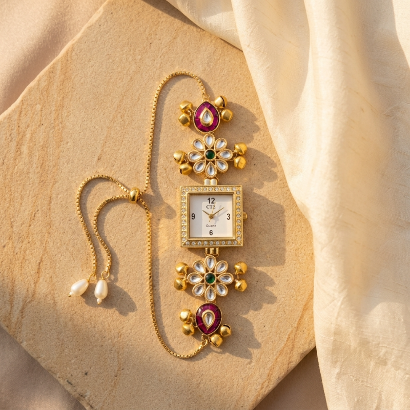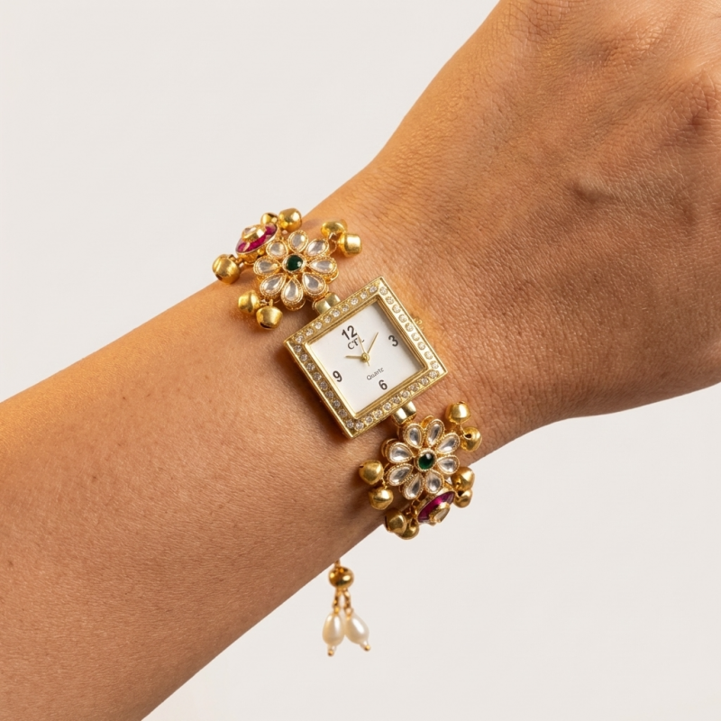 Design: Isme ek rectangular dial hai jiske charon taraf sparkling crystals lage hain. Dial ke upar aur niche intricate floral-shaped Kundan work hai, jisme beech mein ek dark gemstone aur ruby-colored details hain.