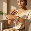 Is elegant traditional Kundan-style bracelet watch ke sath samay batayein royal andaz mein. Yeh timepiece sirf ek ghadi nahi, balki ek behtareen gehna hai, jo aapki kalai ko ek naya aur shandaar roop dega. Yeh khas taur par traditional Indian wear ke sath pair karne ke liye banayi gayi hai.