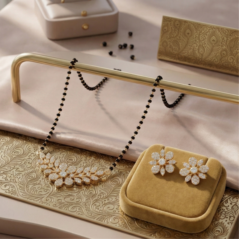 mangalsutra set for women, mangalsutra with earrings, floral mangalsutra design, cz mangalsutra necklace set, black bead mangalsutra jewellery, bridal mangalsutra set, gold plated mangalsutra, traditional indian mangalsutra set
