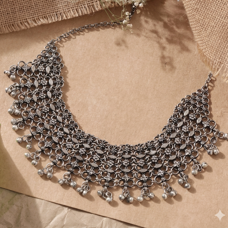 Stunning silver oxidised necklace with intricate floral filigree design and delicate bell-like danglers. The layered choker-style piece showcases an elegant, vintage-inspired craftsmanship perfect for ethnic or boho outfits.
