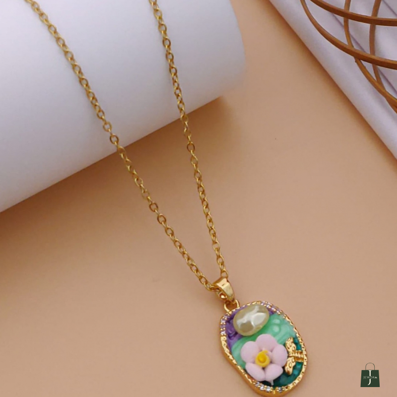 Add a fresh touch of elegance to your jewelry collection with this beautifully crafted floral enamel pendant necklace. The oval-shaped pendant showcases a soft green and lavender background, highlighted by a delicate hand-painted pink flower with a warm yellow center. A pearl-like accent at the top adds a graceful glow, while the tiny gold butterfly detail brings a charming, nature-inspired finish.