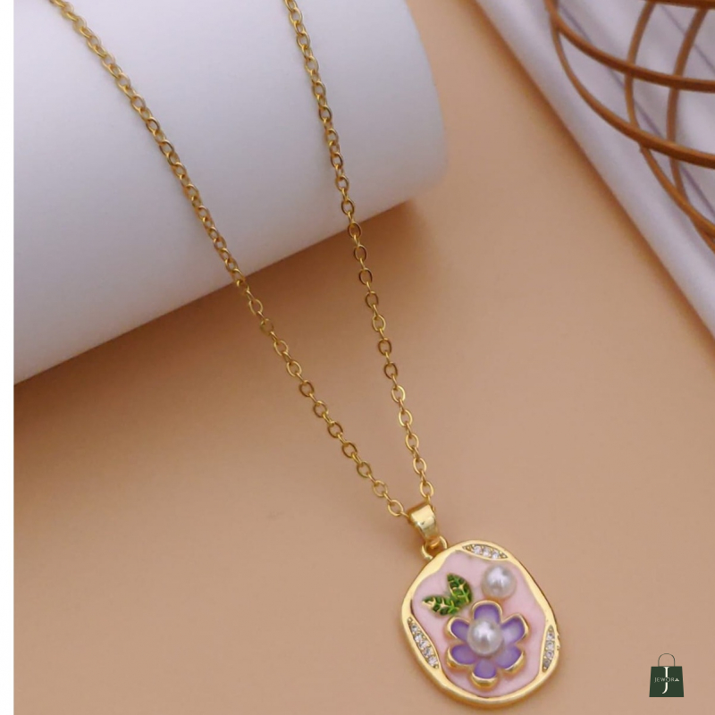 Add a touch of soft elegance to your jewelry collection with this charming floral pendant necklace. Featuring a beautifully crafted oval pendant, this design highlights a delicate purple flower set against a gentle pastel pink enamel background. Accented with two pearl-style details and tiny crystal embellishments along the edges, the pendant creates a graceful balance between sophistication and playful charm.