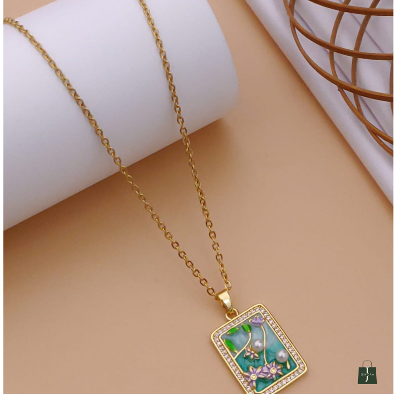 Elevate your style with this elegant rectangular floral pendant necklace, designed to bring a touch of nature-inspired beauty to your everyday look. The pendant features a rich turquoise enamel background, beautifully contrasted with delicate gold-tone vines, soft lavender flowers, and vibrant green leaves. Two pearl-style accents add a subtle shimmer, creating a graceful balance between color and sophistication.