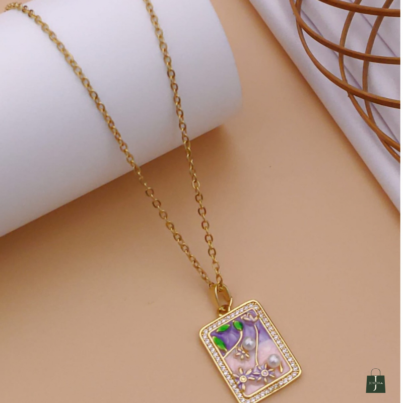 Elevate your everyday style with this elegant floral enamel pendant necklace, designed to blend artistic charm with modern sophistication. The rectangular pendant features a soft pastel background in shades of blush and lavender, delicately accented with hand-painted floral motifs and vibrant green leaves. Tiny pearl-like details add a graceful touch, while the shimmering crystal-style border enhances the overall brilliance of the piece.