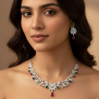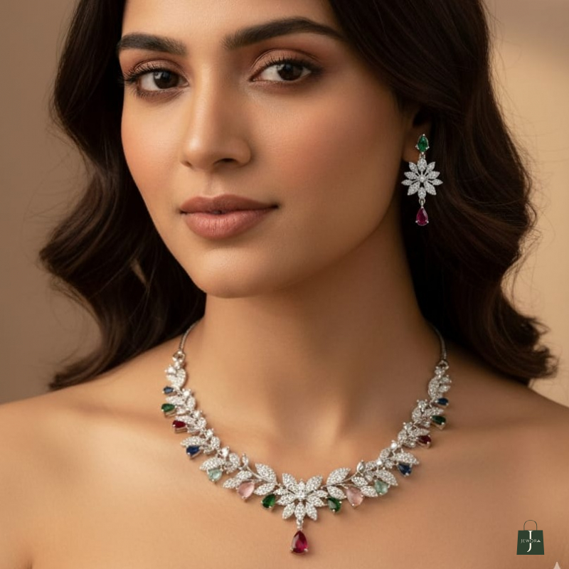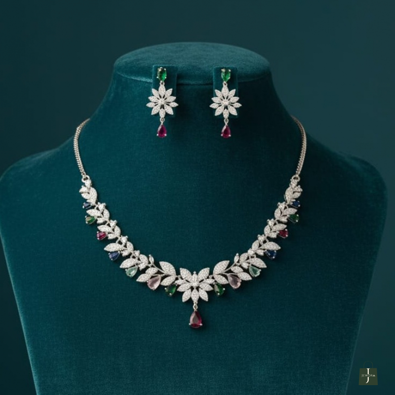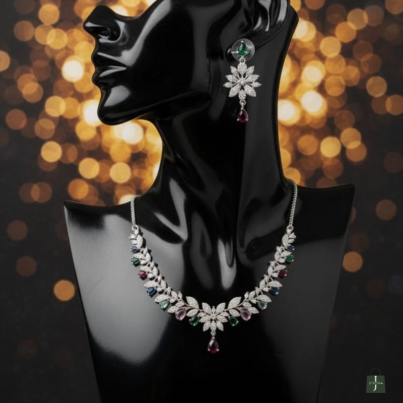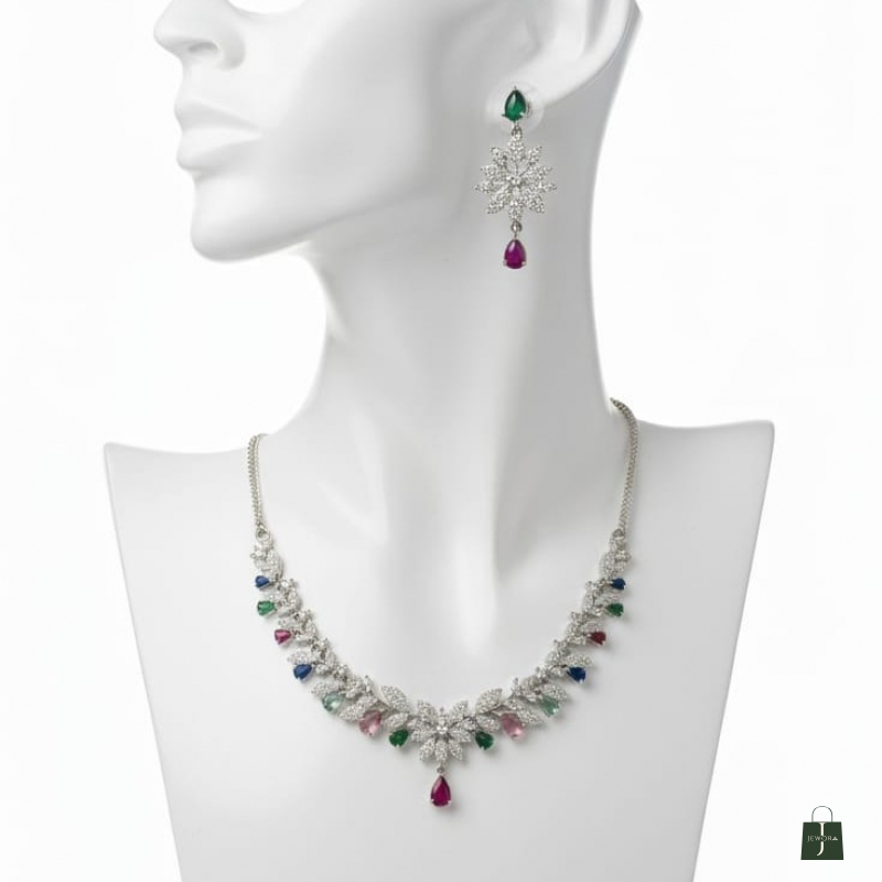 The necklace is beautifully accented with delicate multicolor gemstone drops in rich shades of green, ruby red, sapphire blue, and soft pastel tones, creating a graceful and vibrant silhouette. The central floral pendant with a teardrop gemstone adds a refined focal point, while the matching floral earrings complete the coordinated look.