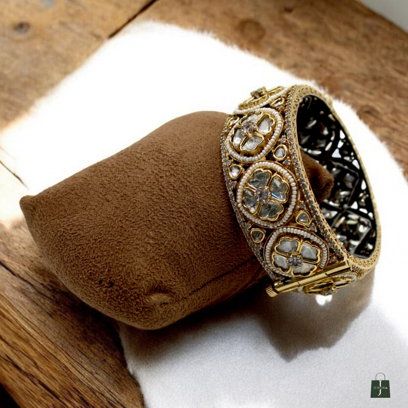 Enhance your traditional jewellery collection with this beautifully crafted Floral Kundan Antique Gold Kada. Designed with elegant floral motifs, this bangle features heart-shaped and petal-shaped Kundan stones arranged in a symmetrical pattern. The fine pearl beading around each floral design adds a soft royal charm.