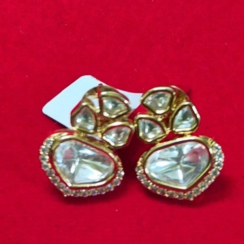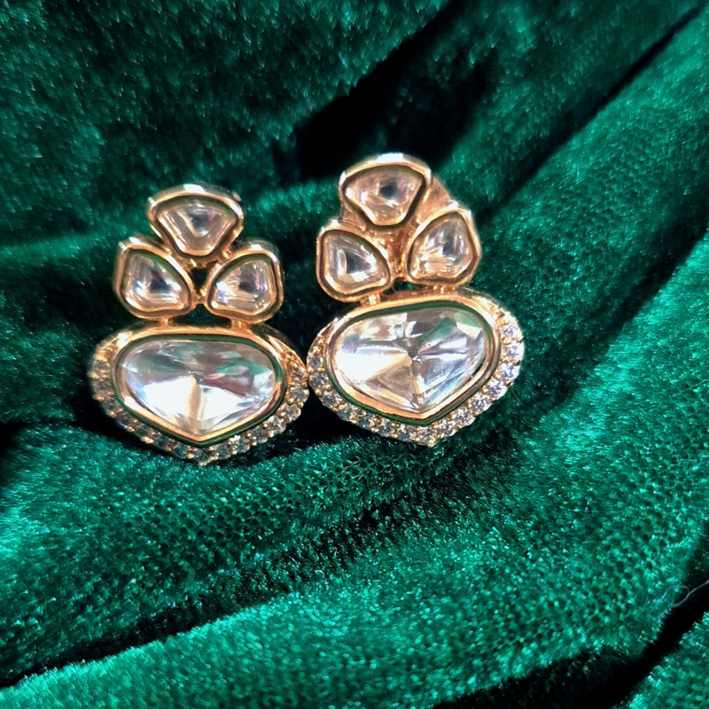 Enhance your traditional charm with these beautifully designed floral stud earrings. Featuring a stunning combination of petal-shaped crystals arranged in a floral motif, these earrings are highlighted with a larger teardrop crystal at the base, surrounded by delicate sparkling accents. The gold-tone finish adds a rich and royal touch, making them perfect for festive occasions and ethnic outfits. A perfect blend of elegance and tradition, these earrings are ideal for adding a graceful sparkle to your look.